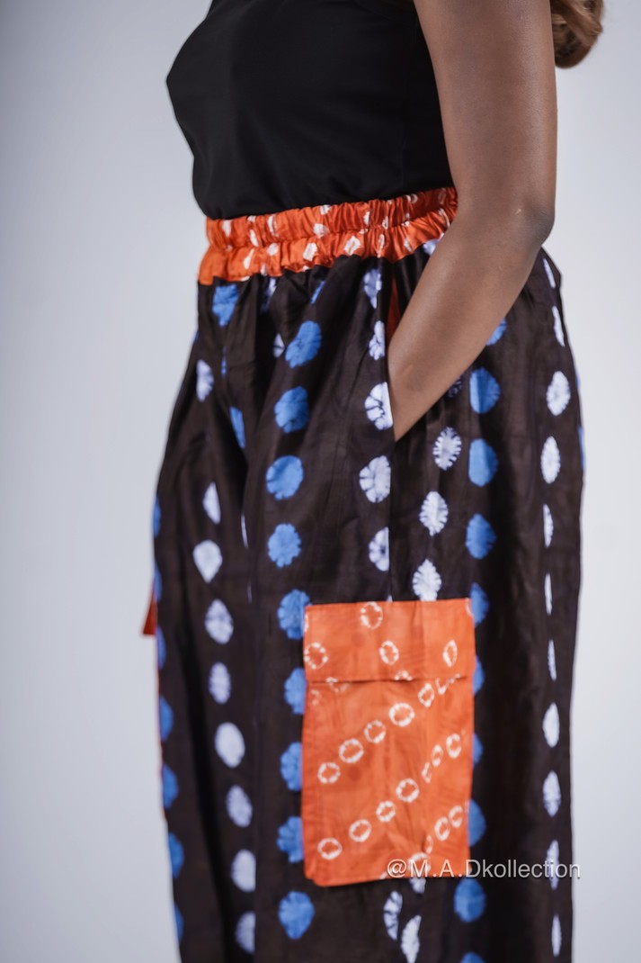 These trousers feature bold luxury Adire patterns with a functional timeless silhouette. The contrasting side pocket fabric adds a stylish edge, while the structured yet comfy fit makes them perfect for everyday slay or elevated casual looks.