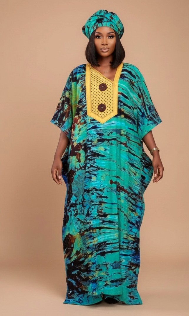 This striking, full-length kaftan dress is a beautiful celebration of color and print, featuring a vivid aqua and turquoise tie-dye batik base that creates a mesmerizing, abstract pattern with accents of deep black and brown. The garment maintains the classic, comfortable kaftan silhouette with wide sleeves and a dramatic drape. The neckline is a standout feature, utilizing a V-neck design accented by a structured, contrasting mustard yellow or gold yoke. This yoke is intricately embroidered and embellished with two large, central brown appliqués, adding a clear, geometric focal point that contrasts beautifully with the fluid pattern of the fabric. Completed with a matching fabric turban, this piece is ideal for bold, artistic statements at casual gatherings, creative events, or resort settings.