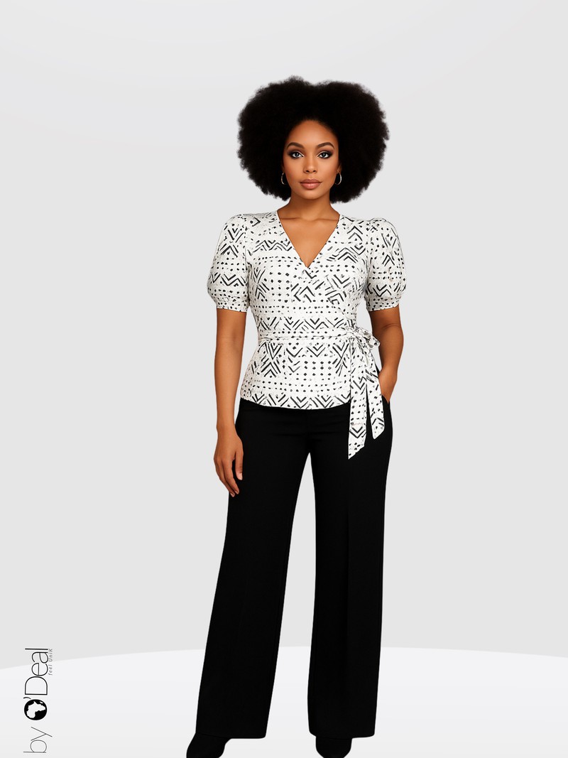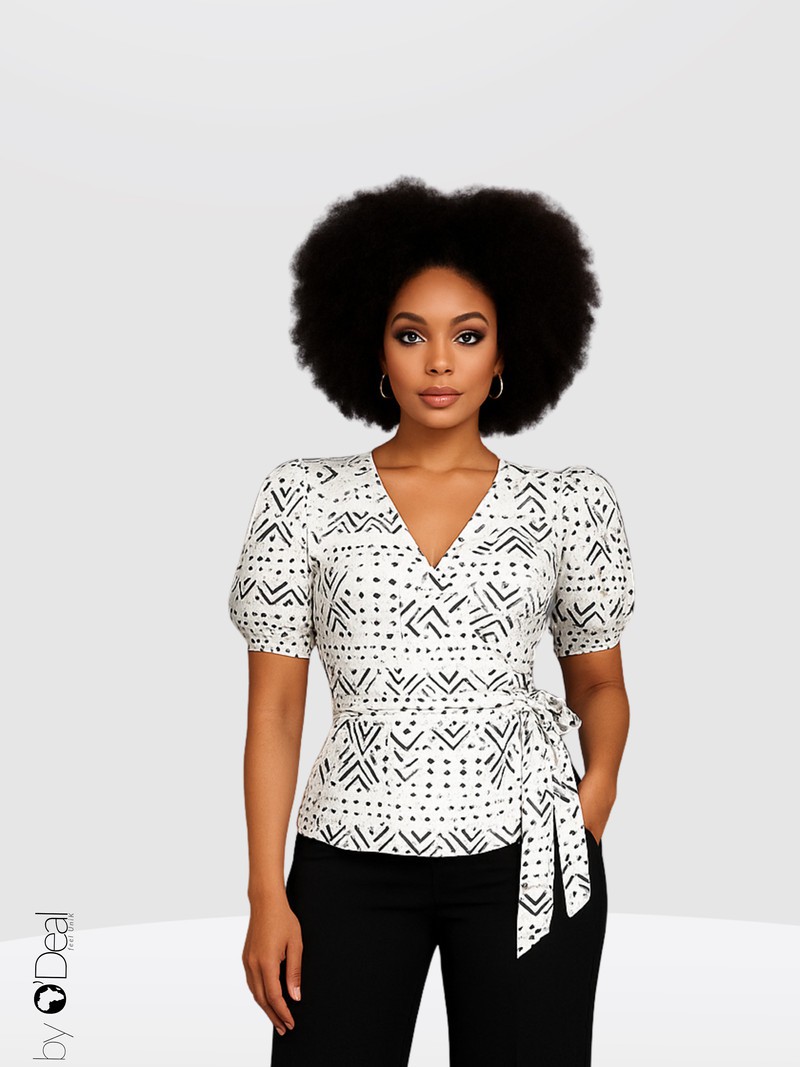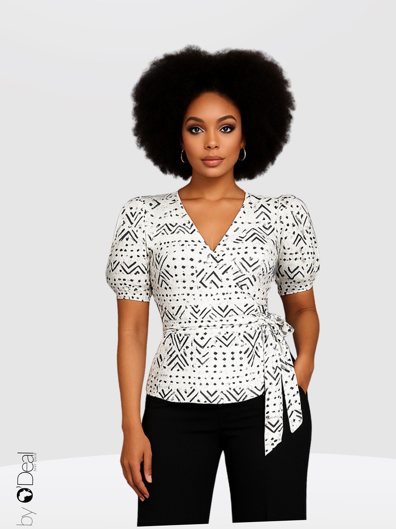 On craque pour ce top cache.coeur qui vous assurera une allure élégante dans un style unique et authentique. Il se porte sur les deux faces, pour un double regard. Les petites manches élastiquées permettent de dénuder les épaules au gré de son humeur. Il s'adapte à tous les types de vêtements, jupe, short ou pantalon et égaiera vos sorties habillées ou décontractées. Craquez et faites des sensations ! Matière : 100% soie satinée imprimé bogolan. Veuillez noter que les motifs bogolan sont aléatoires selon le stock fournisseur. Ils ne correspondent pas toujours à ceux de la photo. Couleurs : marron Vous ne passerez pas inaperçue ! Divers motifs au choix.