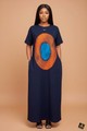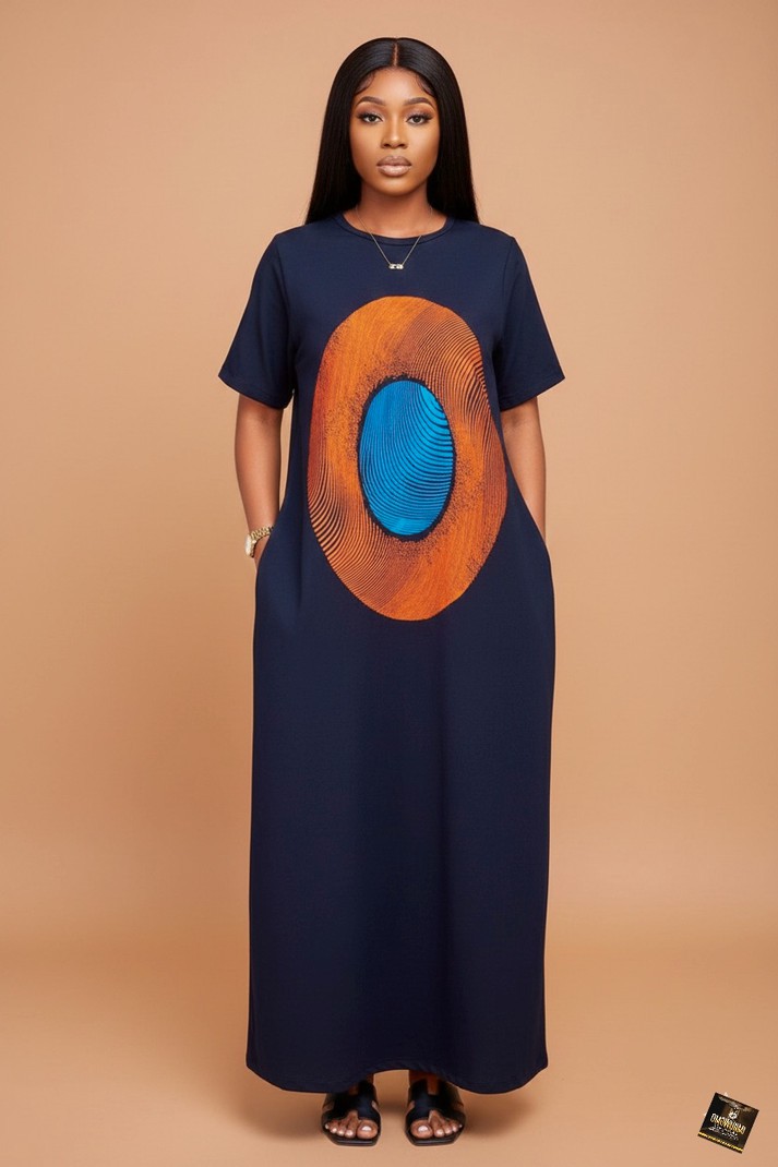 This elegant maxi dress offers a perfect fusion of casual comfort and bold, contemporary artistry, making it an effortlessly stylish choice for any occasion. The garment is rendered in a deep, classic navy blue fabric and features a comfortable, floor-length, straight-cut silhouette with practical side pockets and simple short sleeves and a modest crew neckline. The key design feature is the large, centrally placed circular graphic motif on the chest, which immediately draws the eye with its vibrant color blocking and intricate lines. This striking design comprises an outer ring of warm, swirling burnt orange, contrasting sharply with a bright inner core of electric blue, creating a mesmerizing, almost optical effect inspired by modern artistic patterns. The overall look is one of refined simplicity, allowing the powerful central graphic to make a definitive statement.