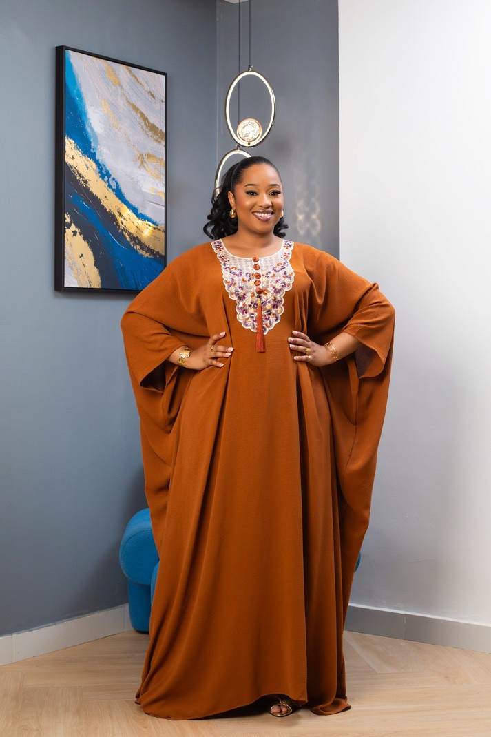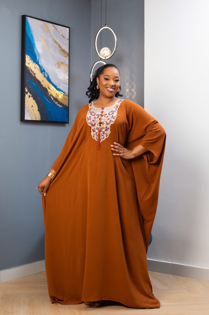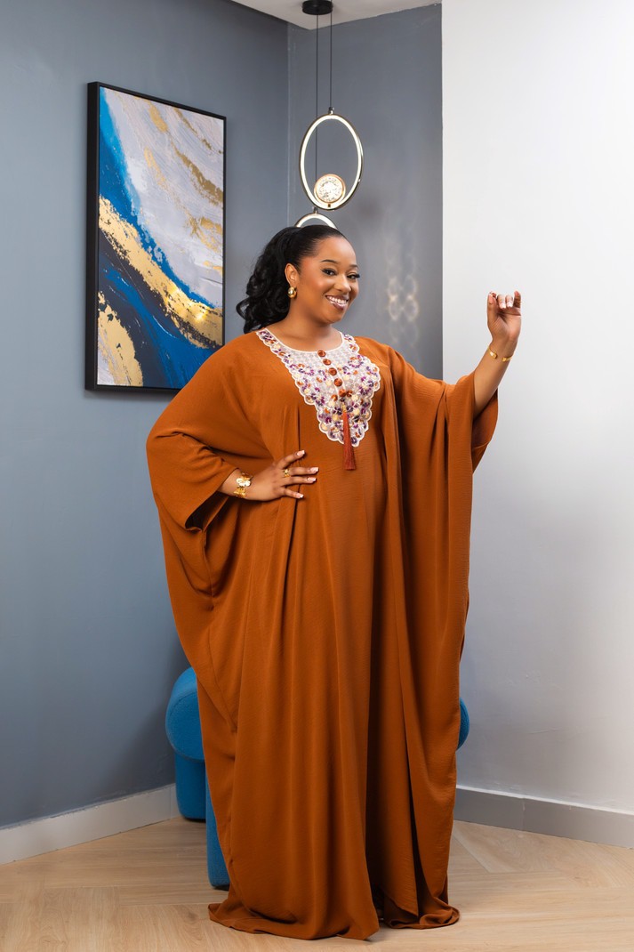 coupe ample en ton marron camel, rehaussée de garnitures beige camel et d'une touche fantaisie "tiar tiar" pour une allure chic et authentique.