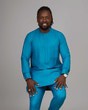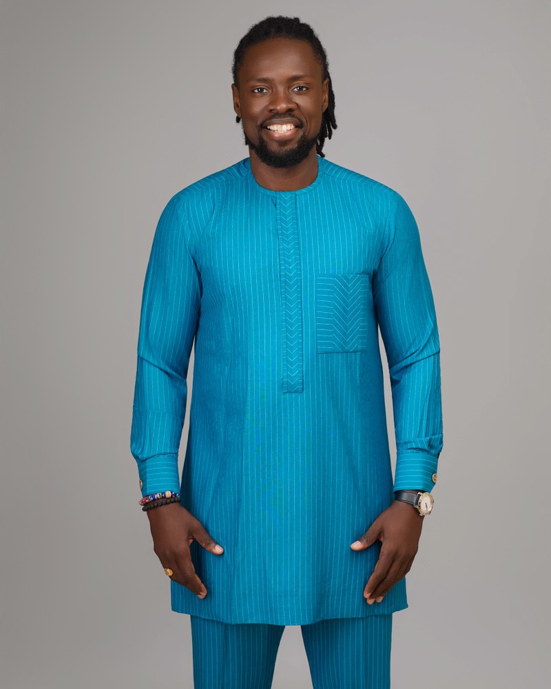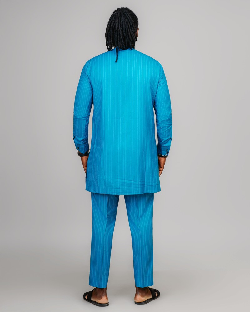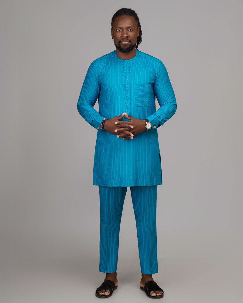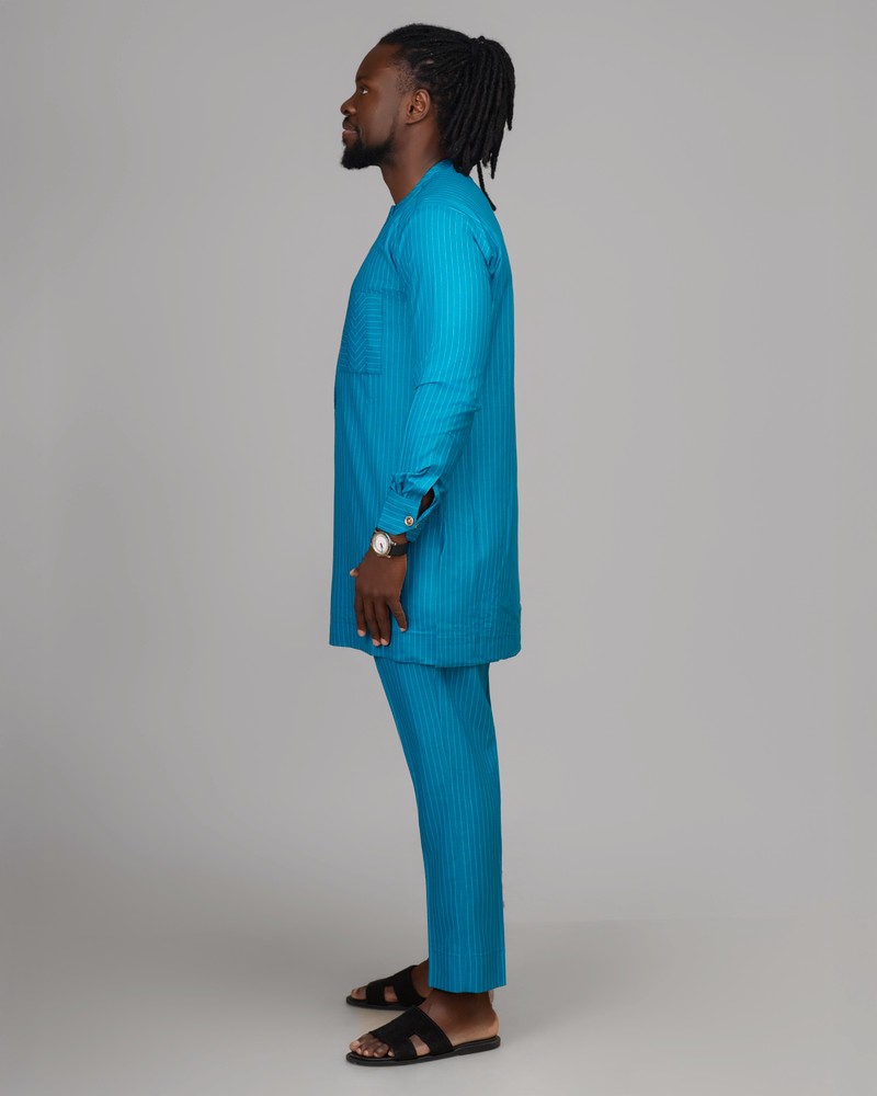L'Ensemble Bleu Majesté est une création emblématique de la Collection Élégance Royale XƆVI, symbole d'assurance, de sérénité et de distinction. Réalisé dans un tissu bleu turquoise à fines rayures satinées, il allie modernité et tradition avec une finesse rare. Son design épuré, relevé par des détails de couture ton sur ton au niveau de la patte et de la poche, offre une allure noble et maîtrisée, idéale pour les hommes qui cultivent le raffinement jusque dans la simplicité.