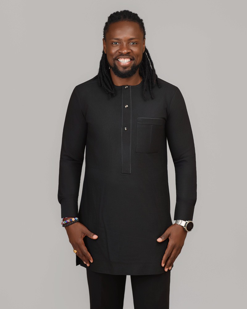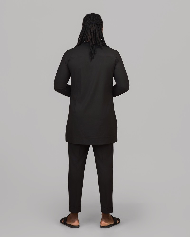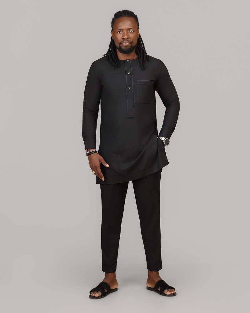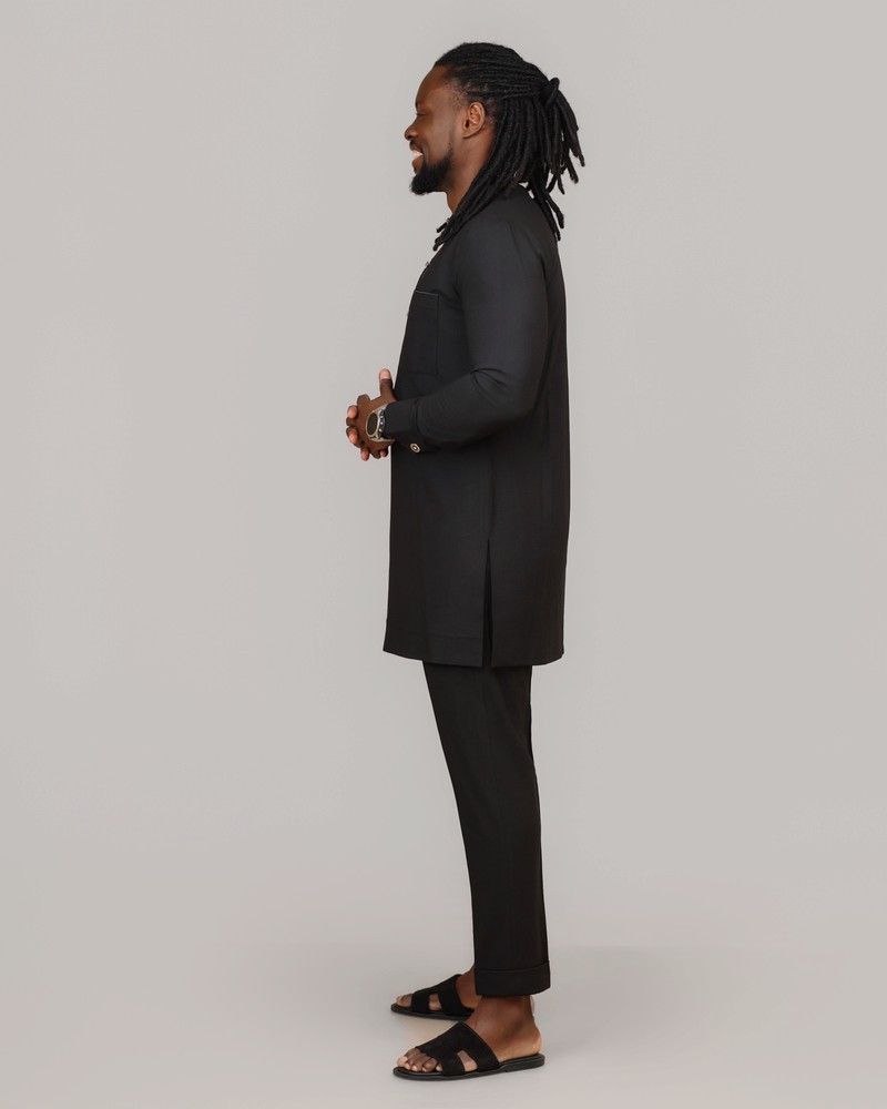 Alliant rigueur de la coupe et raffinement des détails, cette tenue en tissu noir profond révèle une élégance sans compromis. La tunique, structurée par une patte à boutons et une poche poitrine subtile, offre un équilibre parfait entre tradition et modernité.
