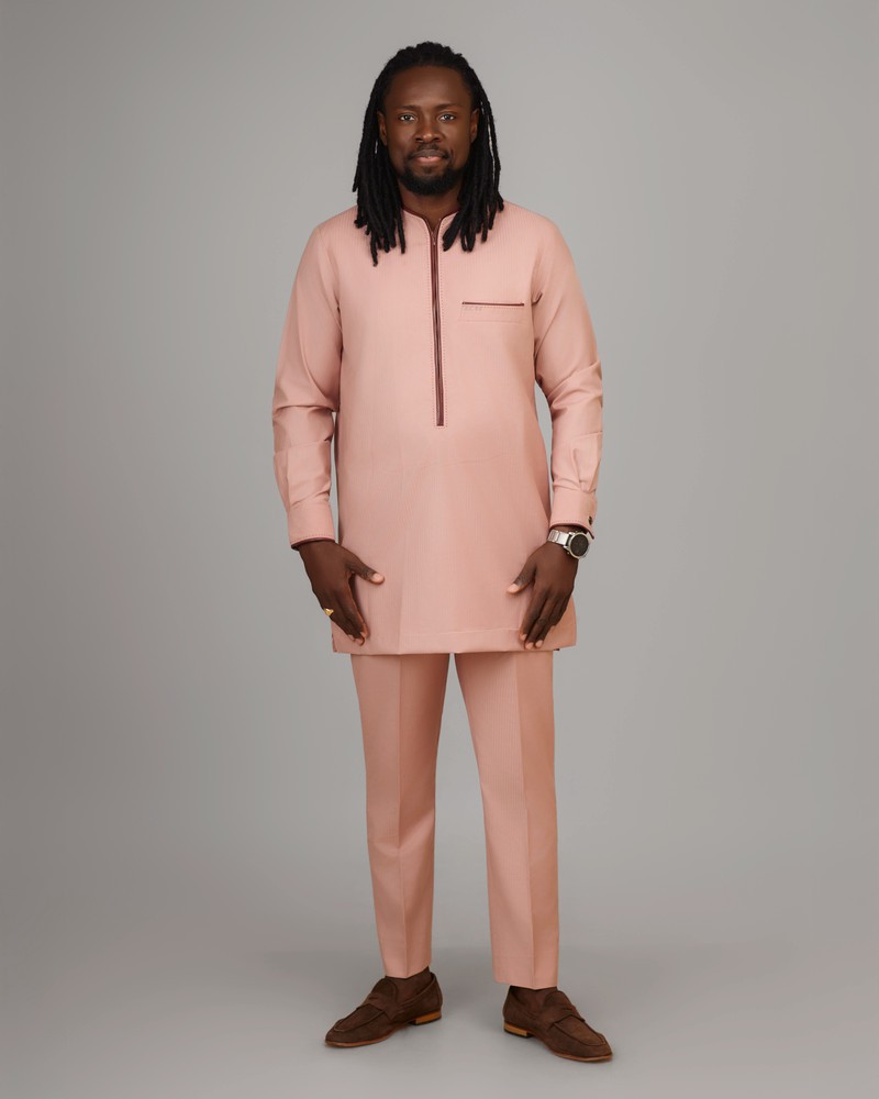 La tunique Rose Sahara est l'expression parfaite de l'élégance sobre et du raffinement discret signés XƆVI. Confectionné dans un tissu doux couleur rose poudré, cet ensemble se distingue par la délicatesse de ses finitions et la finesse de ses détails : un contour de col et une bordure de poche en cuir marron, subtilement contrastés, qui lui confèrent une touche de distinction unique. Idéal pour les hommes en quête d'un style à la fois raffiné, moderne et intemporel, il allie confort et prestige pour les grandes occasions comme pour les moments d'élégance quotidiens.