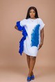 This eye-catching mini-dress is a bold fusion of sculptural design and vibrant artistic detail, perfect for making a memorable entrance. The garment is made from a crisp, comfortable crepe fabric that holds the dress's unique shape while remaining breathable and easy to wear. Rendered in a clean bright white hue, the dress features a relaxed tunic or shift silhouette that falls above the knee, complete with short, simple cap sleeves on the right. The design's dramatic focal point is the cascade of electric royal blue ruffles that run diagonally down the left side, from the shoulder to the hem, adding volume, movement, and a stunning textural contrast. On the opposite side, a beautifully detailed, hand-painted or digitally printed blue feather graphic creates a balanced artistic element. This unique, fashion-forward piece is ideal for upscale resort wear, themed parties, engagement photos, sophisticated summer cocktails, or any event that calls for high-impact, statement dressing.