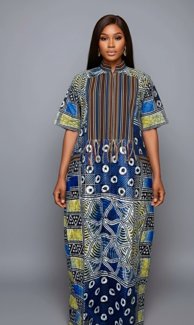 This Contemporary Geometric Kaftan is a striking fusion of traditional African textile arts and modern design, meticulously crafted from high-quality, breathable cotton that ensures a lightweight yet structured silhouette. The garment showcases a vibrant patchwork of hand-dyed Batik and Adire prints in deep sapphire, electric blue, and lime green, featuring intricate circular and petal-like motifs that create a dynamic visual energy. A sophisticated high-collared neckline is accented by a central vertical-striped panel with fringe detailing, adding a layer of tactile interest and refined craftsmanship to the modest, floor-length design. This versatile piece is an ideal choice for high-end cultural festivals, elegant outdoor garden parties, or luxury travel wear, offering a perfect balance of comfort and statement-making style. Whether you are attending a boutique art opening or a celebratory family gathering, this kaftan provides a regal and artistic presence that celebrates heritage with a modern edge.