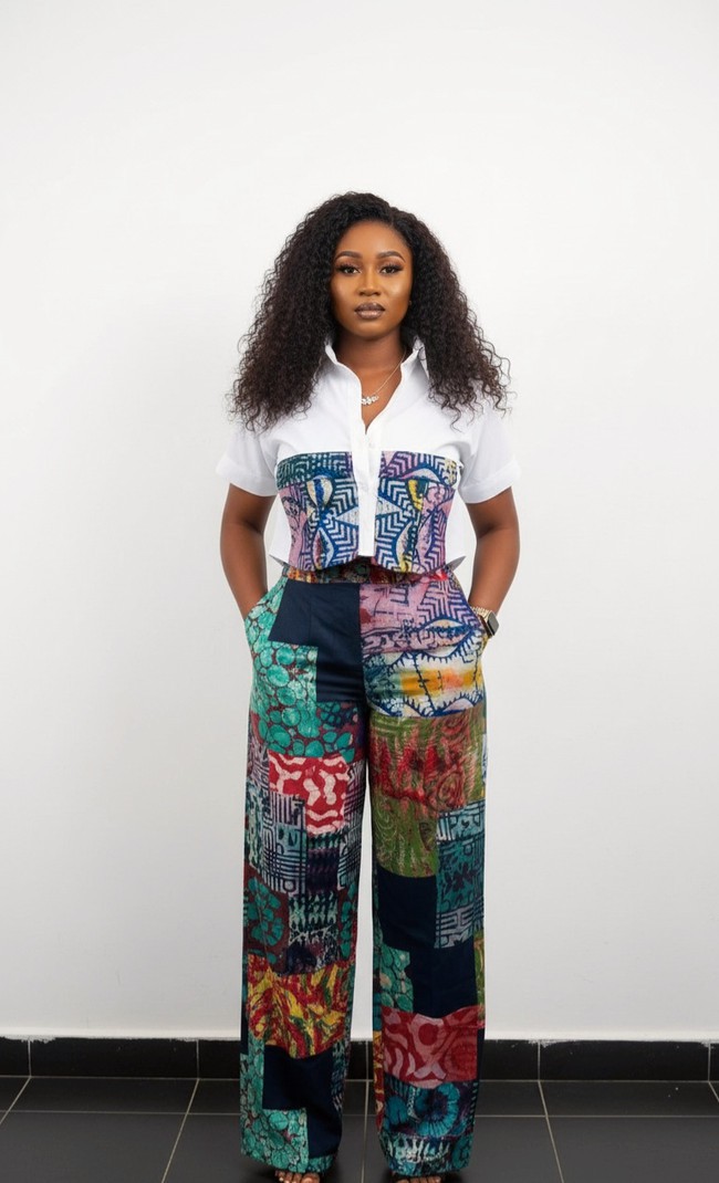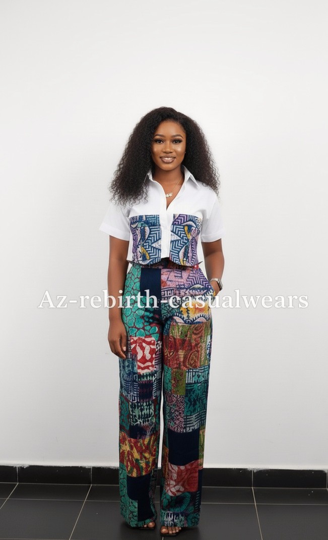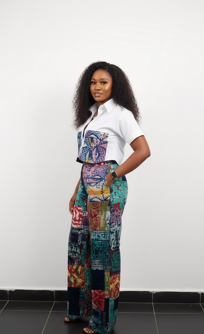 Step out in style with this unique two-piece outfit made with a blend of Kampala (Adire) fabric and crisp white fabric. The design features a smart white shirt with a touch of colorful Kampala detailing, paired with wide-leg patchwork Kampala trousers that add elegance and comfort.