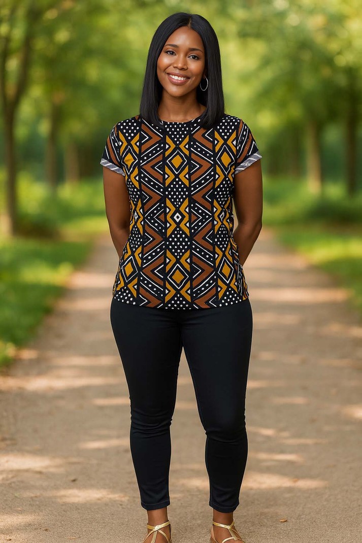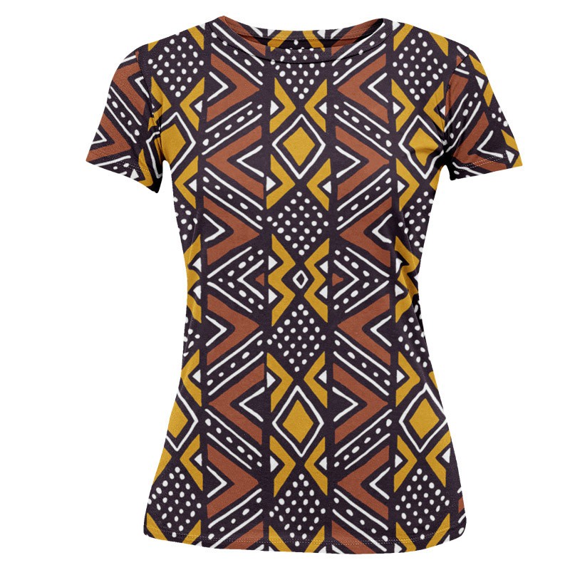 This African Mudcloth Print Women T-shirt showcases a unique and culturally-inspired design. Made from high-quality materials, this t-shirt offers a comfortable fit perfect for everyday wear. Embrace the bold and vibrant style of African prints with this one-of-a-kind piece. Product Features Please Compare your Measurements To our Size Chart This T-shirt is Designed for fashionable women. Made from 5.47 Oz. 100% polyester. Double-needle hemmed sleeves and bottom. Vivid print that will never fade after washing Soft, lightweight and quick drying. Delivery Time This item will be processed within 3-7 business days (Excluding Weekends and Holidays). Once products ships it can take up to 15 Business days depending on your location. Out of Stock items can be requested by emailing us at [email protected] Care Instructions Machine wash cold inside out. Gentle cycle with mild detergent and like colors. Do not use bleach or fabric softener. Do not tumble dry. Hang to dry to ensure maximum shelf life. Iron inside out if necessary. Do not iron the print. Do not dry clean.