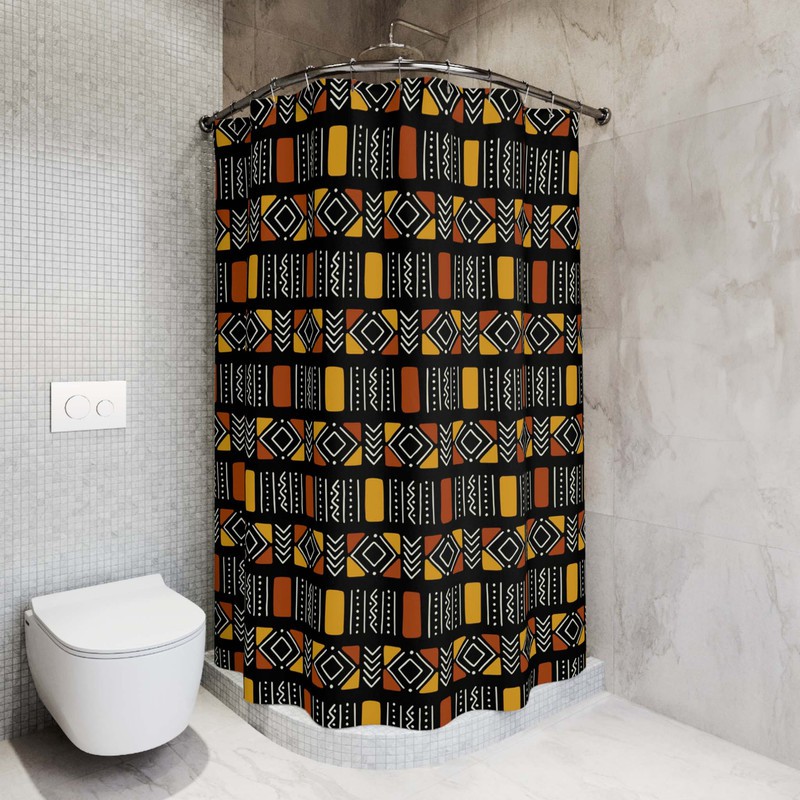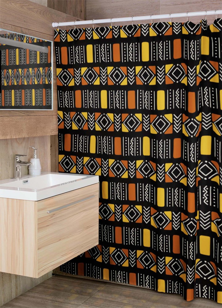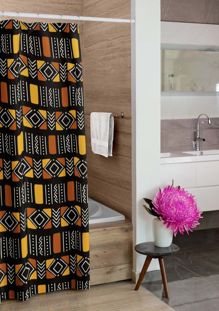 Experience the daring and unique culture of Africa with our Shower Curtain featuring a bold Bogolan print. Embrace adventure in your daily routine and transform your bathroom into an exotic escape. Add a touch of risk-taking to your bath time with this one-of-a-kind curtain. Product Features = Designed for standardized bath tubs, fitted with C-shaped curtain hooks, = Tough durable waterproof polyester fabric = Prevents water from splashing out of the shower stall. = One-side print using heat dye sublimation technique for long-lasting effects. = Both functional and decorative. = Vibrant colors = CURTAIN SIZE - W 36"x H 72"-91cmx182cm Delivery Time This item will be processed within 7-15 business days (Excluding Weekends and Holidays). Once products ships it can take up to 15 Business days depending on your location. Out of Stock items can be requested by emailing us at [email protected]
