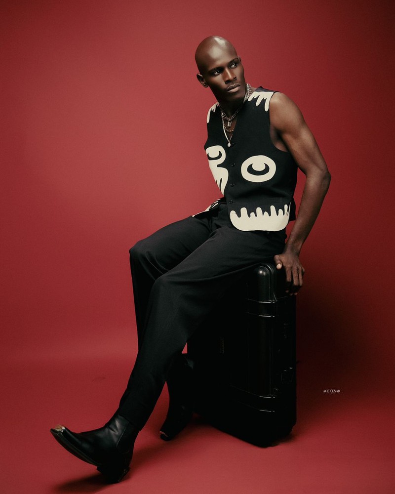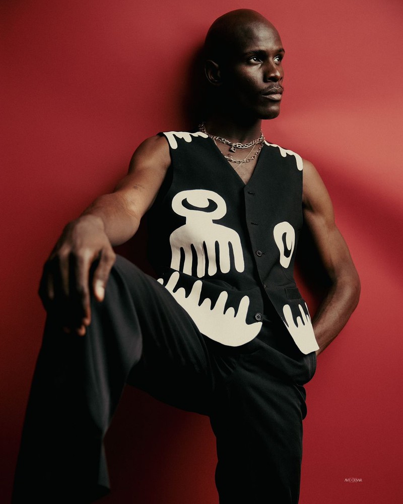 Set against a deep black canvas, the contrasting white motifs bring graphic rhythm and balance. Dripping edges and fluid shapes soften the sharp tailoring, creating a wearable statement that flows between heritage and individuality.