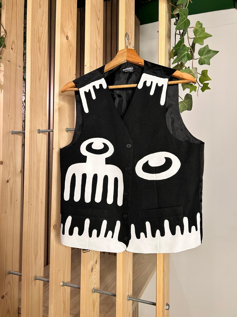 The Vest Duafe 1 is a bold reinterpretation of elegance through symbolism. Featuring the hand-painted Duafe symbol, an Adinkra emblem representing feminine energy, self-care, cleanliness, and nurturing, this sleeveless piece merges cultural meaning with contemporary design. Set against a deep black canvas, the contrasting white motifs bring graphic rhythm and balance. Dripping edges and fluid shapes soften the sharp tailoring, creating a wearable statement that flows between heritage and individuality.