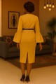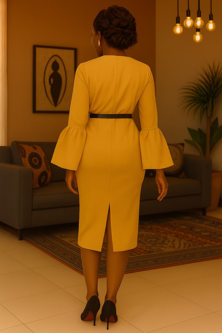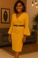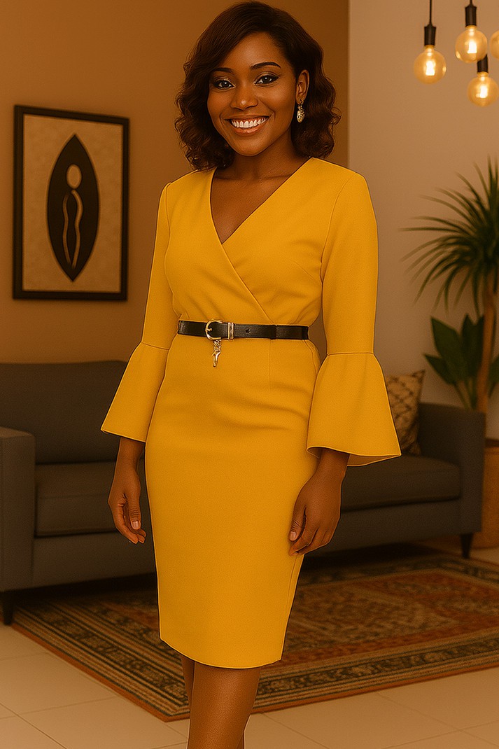 Brighten your wardrobe with this vibrant yellow dress featuring graceful bell sleeves and a classic wrap design. The fitted midi silhouette flatters your figure while offering comfort and style for any occasion. Perfect for adding a cheerful touch to your day, this dress supports your confidence with every wear.