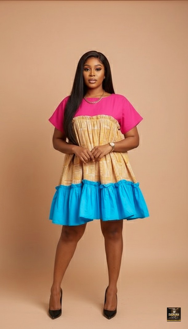 The Sunshine Mini is a cheerful explosion of colour and volume, designed for carefree confidence and fun outings. This vibrant babydoll dress features a striking colour-blocked design, utilizing a hot pink ankara bodice, a patterned mustard-and-gold mid-section, and a voluminous, beautifully ruffled hemline in bright sky blue. Its loose, generous fit provides maximum comfort and movement, while the bold palette guarantees you’ll stand out. This piece is perfect for weekend brunches, summer festivals, casual birthday gatherings, or lively outdoor markets.