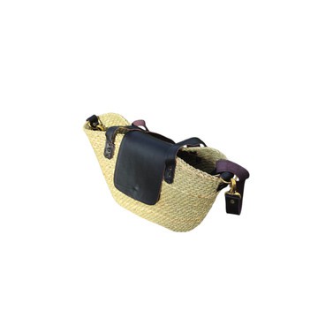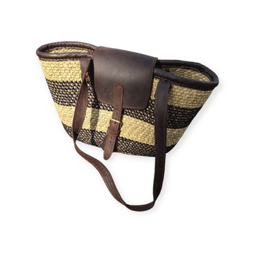 Natural colored basket made from milulu grass finished with leather and accessories with brass.