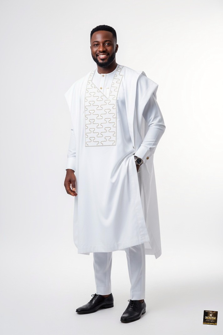 Make a bold statement with this luxury White agbada set, a perfect blend of tradition and modern sophistication. Expertly tailored from premium quality fabric, this three-piece outfit includes a long embroidered agbada robe, a matching inner top, and well-fitted trousers. The detailed embroidery adds a regal touch, making it ideal for weddings, traditional ceremonies, and special occasions.