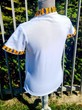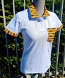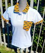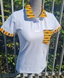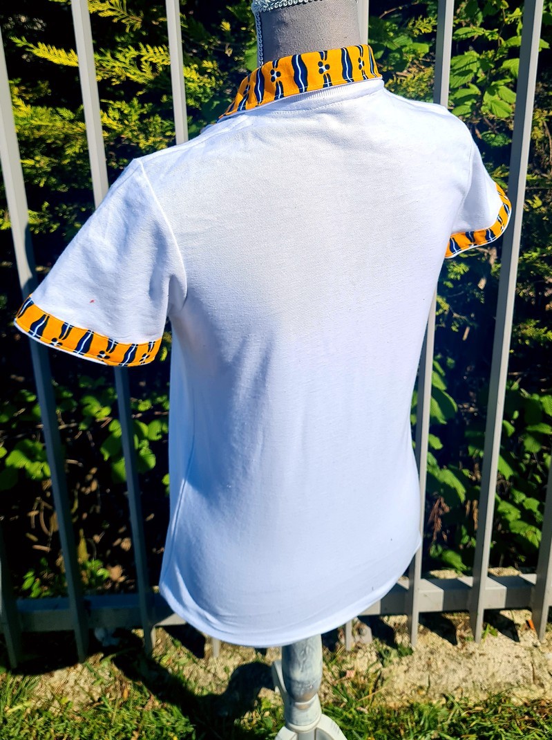 Polo blanc femme fait main avec une touche de wax Bogolan " Mon Mari capable "