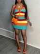 Women's Halter Neck Bodycon Dress - Color Block Striped Summer Dress with Vertical Blue to Orange Stripes, Machine Washable Casual Beach Party Vacation Outfit, Stretchy Fabric