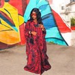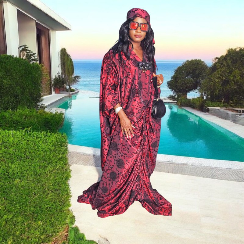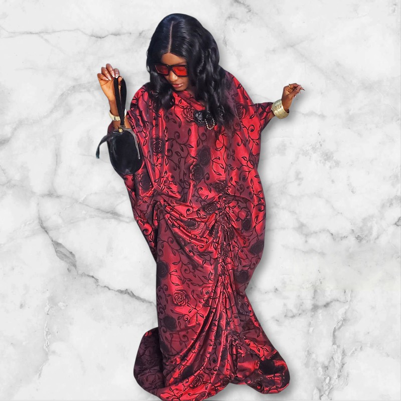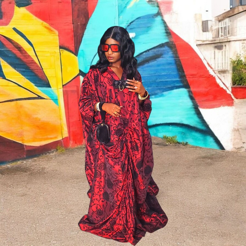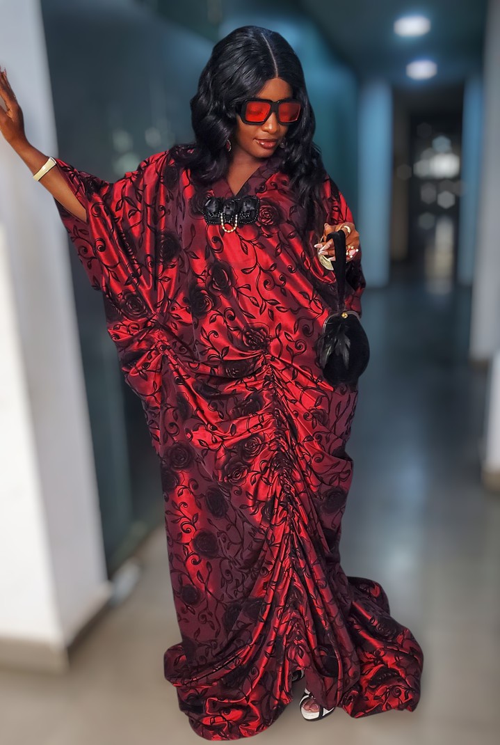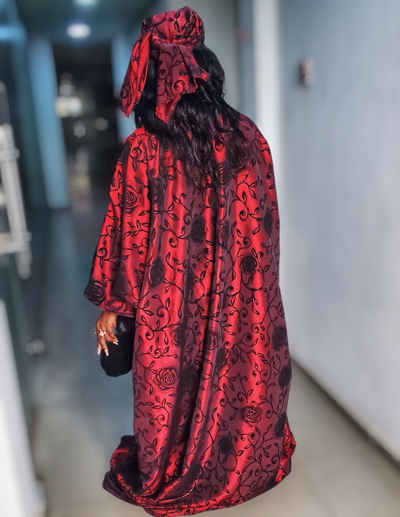 Delicately handmade from a very rare luxury fabric designed with embossed velvet patterns, this piece is designed as a drape-style boubou.
