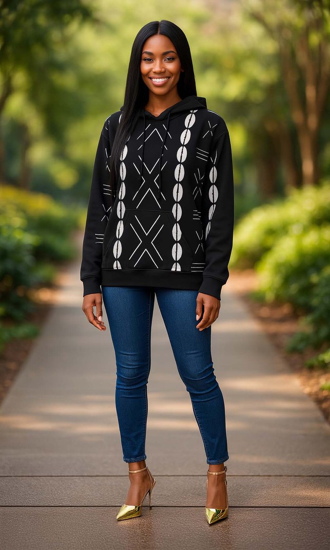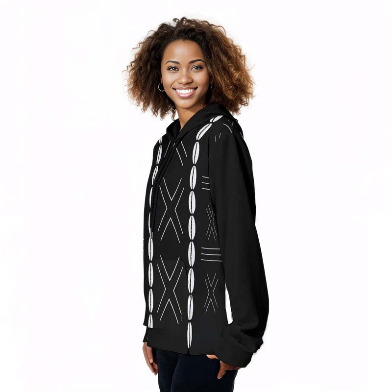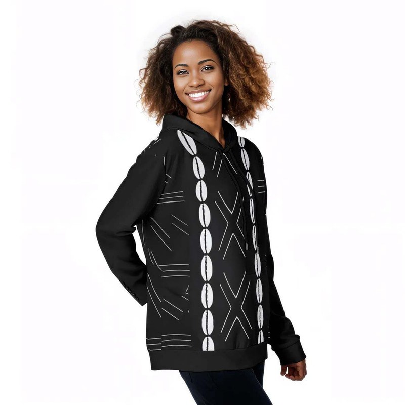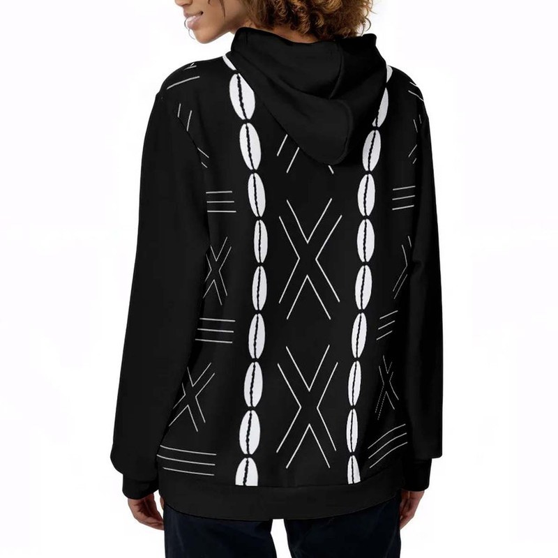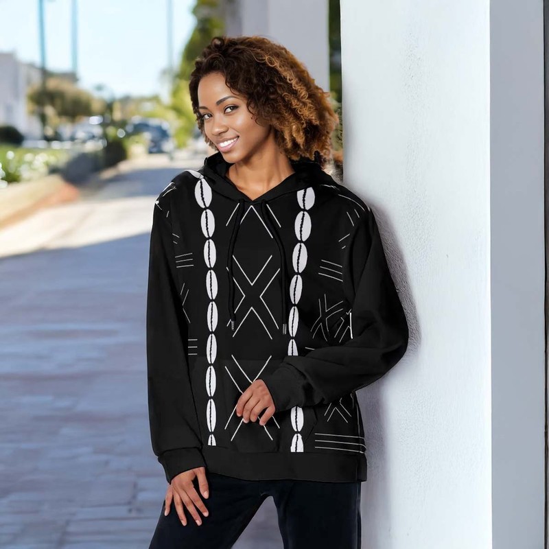 Get ready to grab the attention with this unique African Hoodie in Black and White! Featuring a playful Cowrie Shell print, this hoodie is perfect for any stylish and quirky individual. Guaranteed to make moo-ves wherever you go. Product Features Please Compare your Measurements To our Size Chart *Polyester 94%, Spandex 6%, super soft. *Personalized classic-cut hoodie for Women, comfortable and stylish. *Features pronounced sleeve cuffs, prominent waistband hem and kangaroo pocket fringes. *Taped neck and shoulders for comfort and style. Delivery Time This item will be processed within 3-7 business days (Excluding Weekends and Holidays). Once products ships it can take up to 15 Business days depending on your location. Out of Stock items can be requested by emailing us at [email protected] Care Instructions Machine wash cold inside out. Gentle cycle with mild detergent and like colors. Do not use bleach or fabric softener. Do not tumble dry. Hang to dry to ensure maximum shelf life. Iron inside out if necessary. Do not iron the print. Do not dry clean.