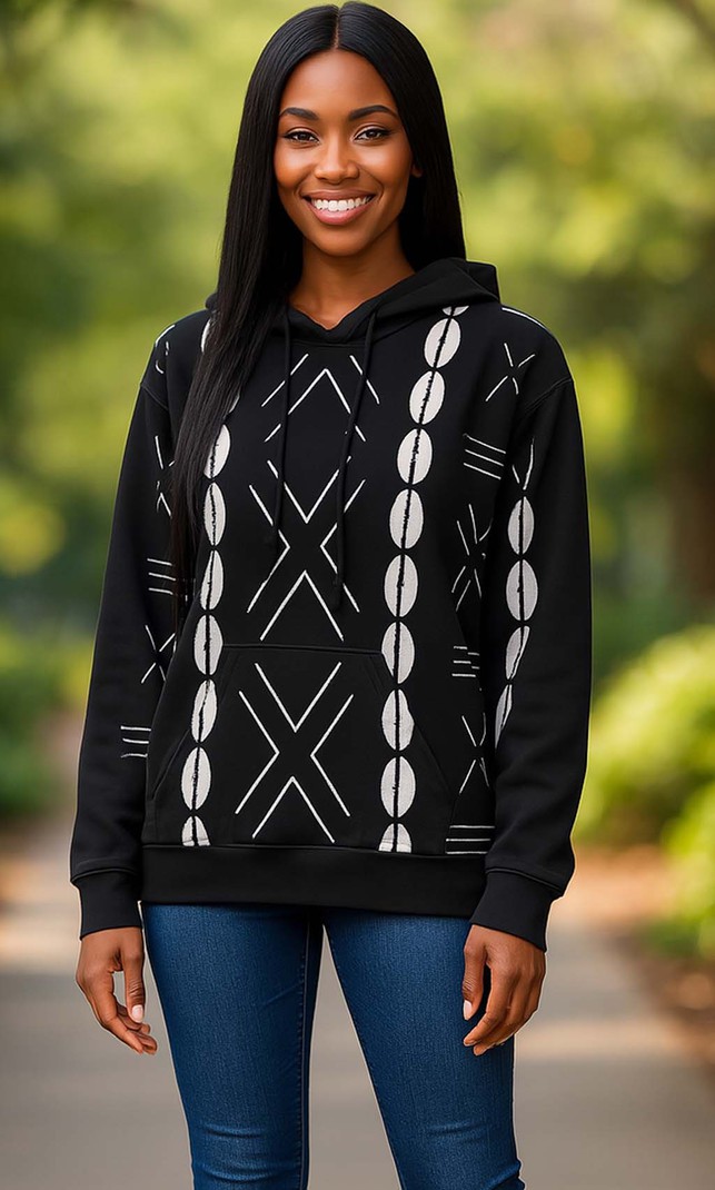 Get ready to grab the attention with this unique African Hoodie in Black and White! Featuring a playful Cowrie Shell print, this hoodie is perfect for any stylish and quirky individual. Guaranteed to make moo-ves wherever you go.