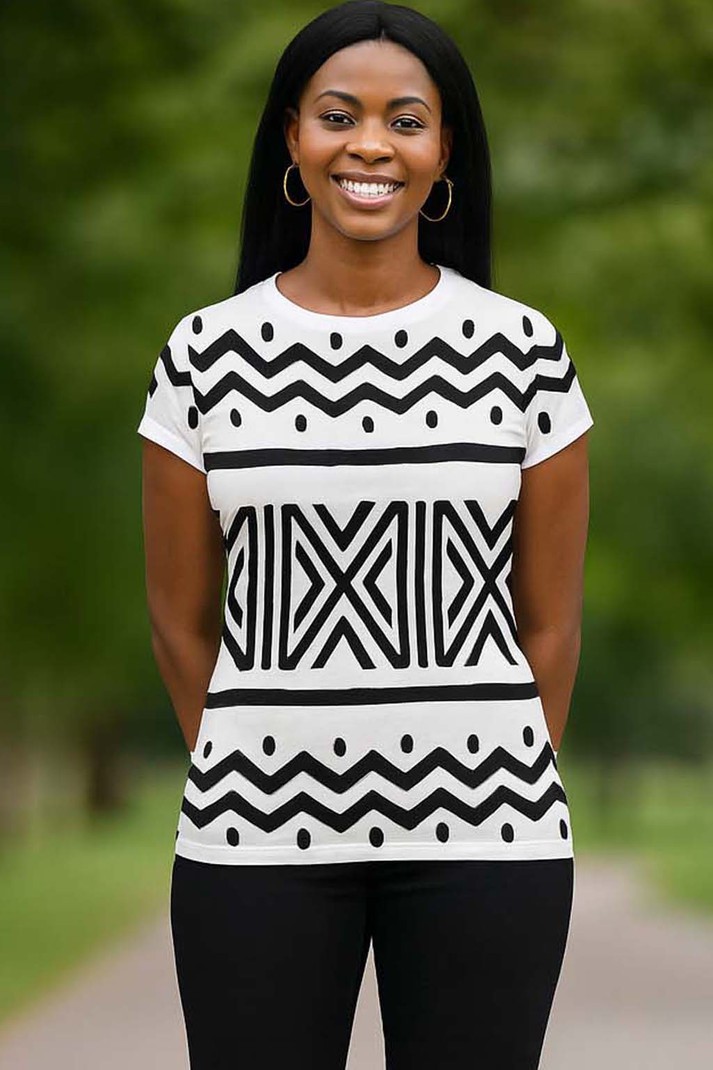 Introducing our African Zigzag Print Women T-shirt - a unique and stylish addition to your wardrobe. Made with high-quality fabric, this shirt boasts a chic zigzag print that adds an eye-catching touch to any outfit. Embrace the beauty of African design and elevate your fashion game with this must-have piece.