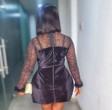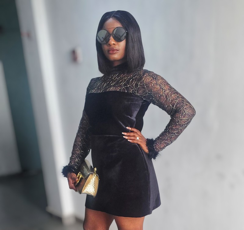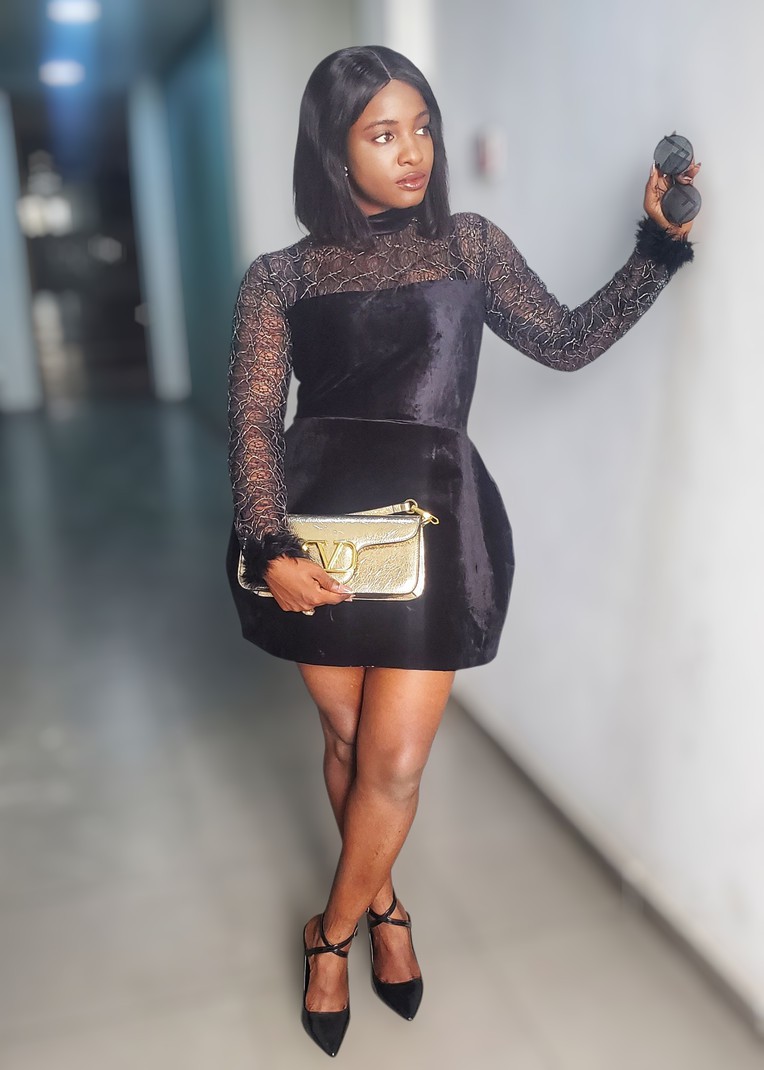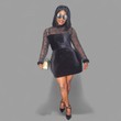Delicately handmade from premium quality velvet and stretchy lace fabrics, this piece is designed as a high-neck long-sleeve short dress with fur on the wrists.