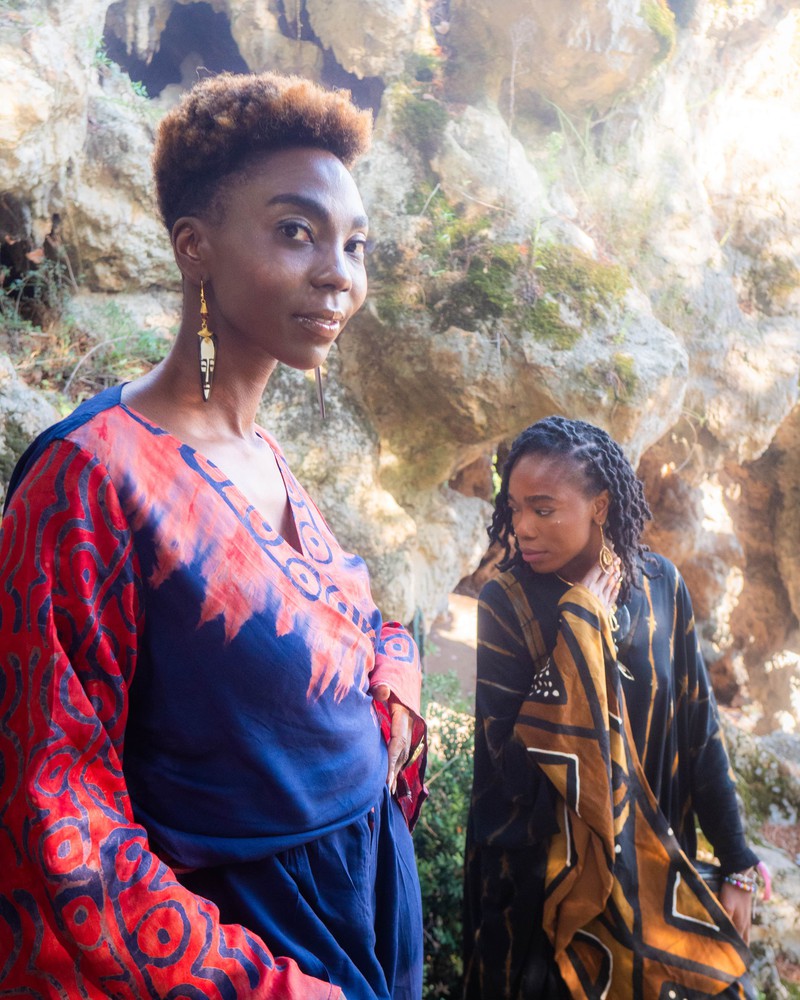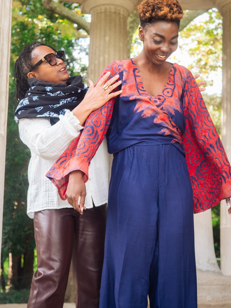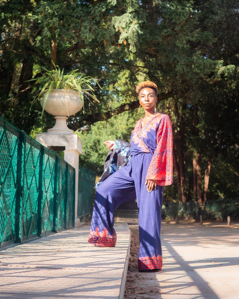 Le tissu batik, avec ses motifs artisanaux et ses couleurs vibrantes, donne à l’ensemble une touche authentique, chic et contemporaine.