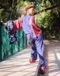 Ensemble composé d’un pantalon fluide et d’un cache-cœur en tissu batik.