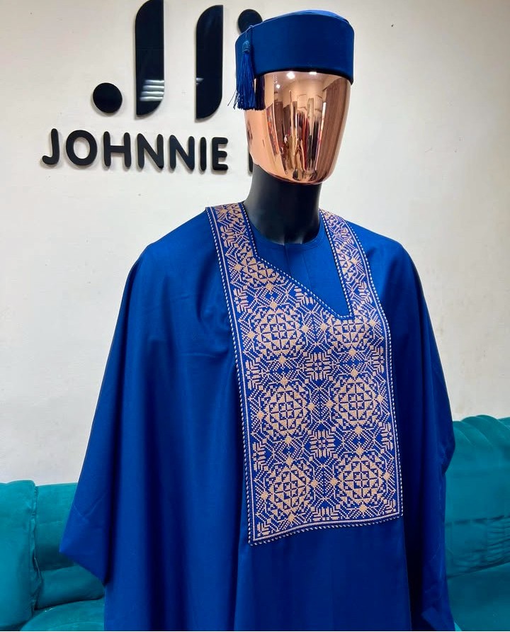 3 pieces agbada sets with a matching pants and a customized hat. You can get the hat customized to your preferred size.. Delivery is within 7 working days Color: blue Gender: For Him Material: Cashmere, Cotton