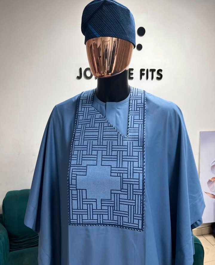 3 pieces agbada sets with a matching pants and a customized hat. You can get the hat customized to your preferred size.. Delivery is within 7 working days Color: blue Gender: For Him Material: Cashmere, Cotton