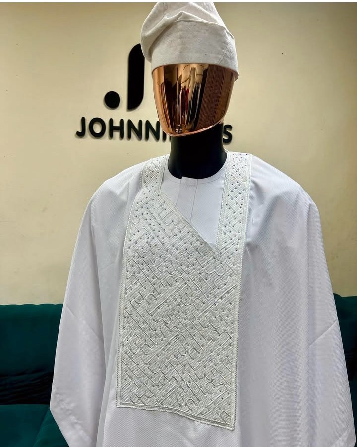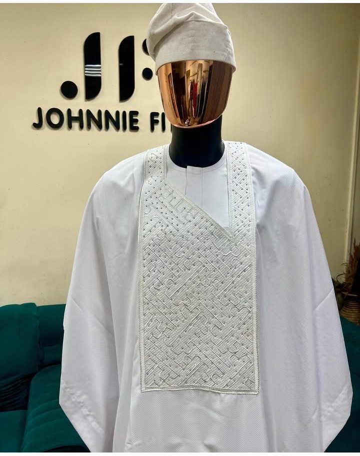 3 pieces agbada sets with a matching pants and a customized hat. You can get the hat customized to your preferred size.. Delivery is within 7 working days Color: white Gender: For Him Material: Cashmere, Cotton