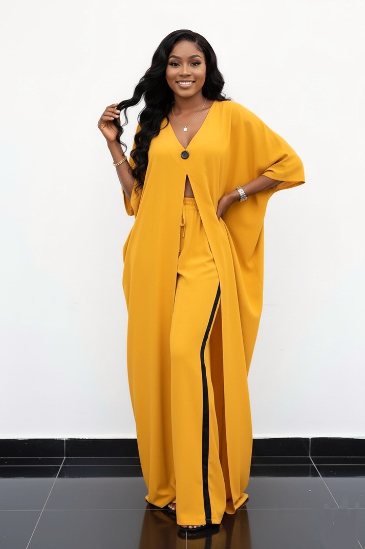 Elevate your style with this stunning 3-piece set made from premium crepe fabric. The outfit features wide-leg trousers with a sleek side stripe, a chic loose-fit kimono jacket with a front button detail, and a matching turban headwrap for a complete, elegant look. ✨ Features: Made with high-quality crepe fabric (lightweight & breathable) Includes trousers, kimono jacket & matching turban Elegant wide-leg cut with side stripe design Relaxed yet classy fit – perfect for any occasion Available in all sizes (S – XXL and custom sizes on request)