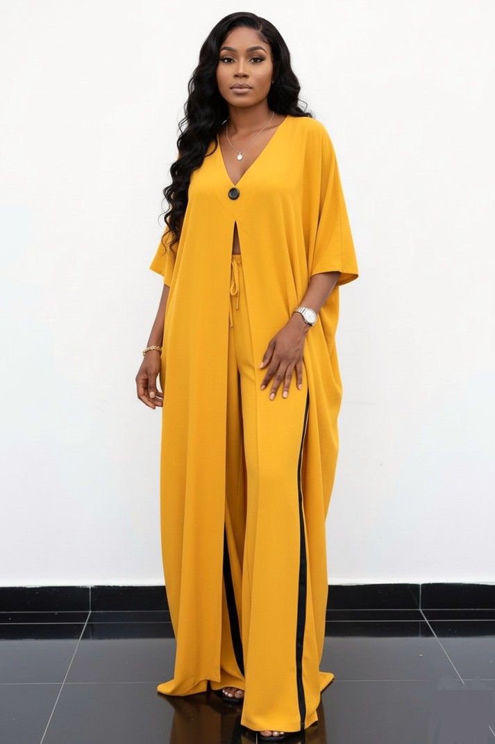Elevate your style with this stunning 3-piece set made from premium crepe fabric. The outfit features wide-leg trousers with a sleek side stripe, a chic loose-fit kimono jacket with a front button detail, and a matching turban headwrap for a complete, elegant look.