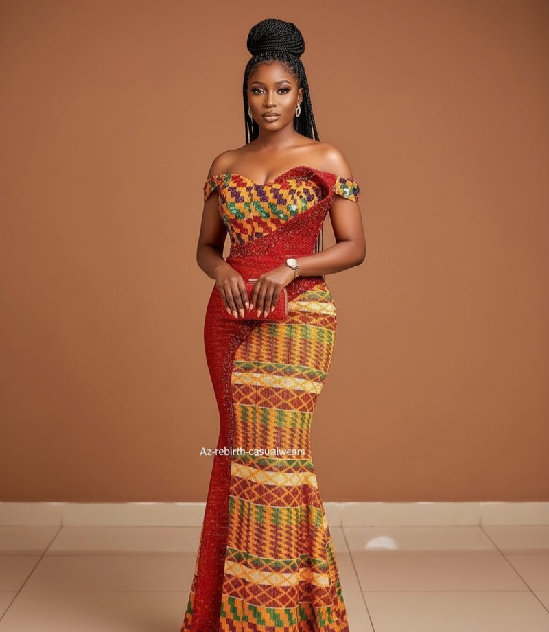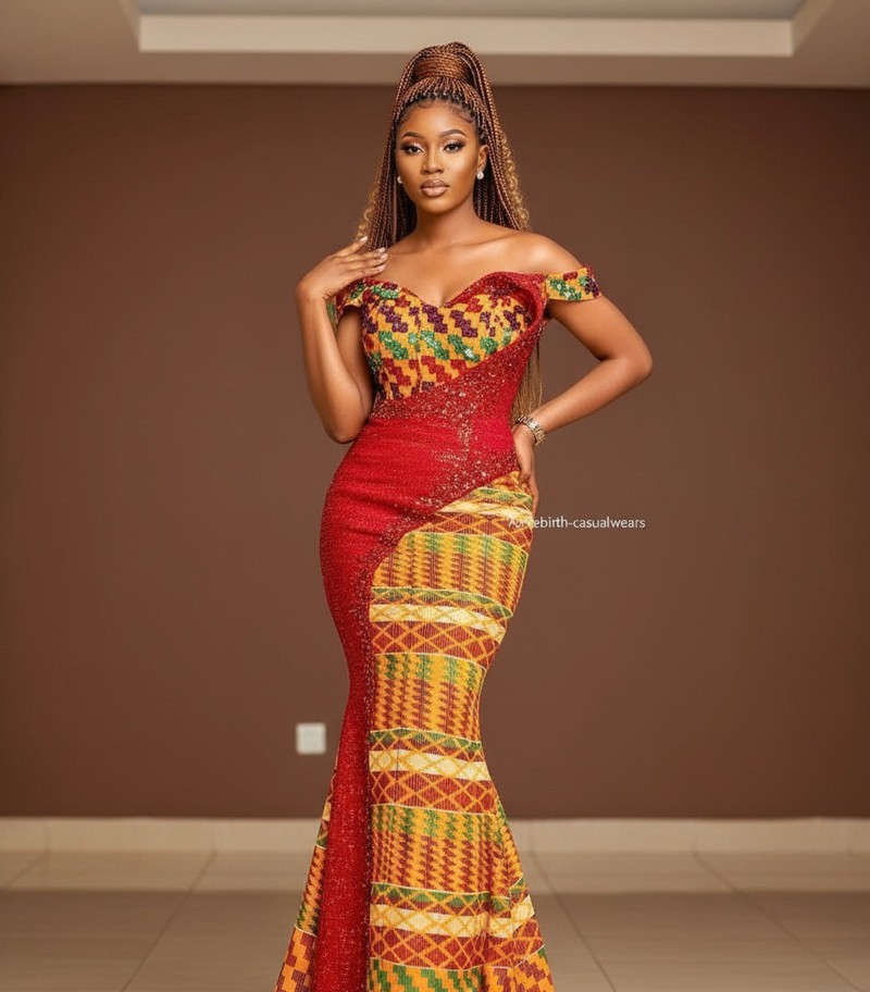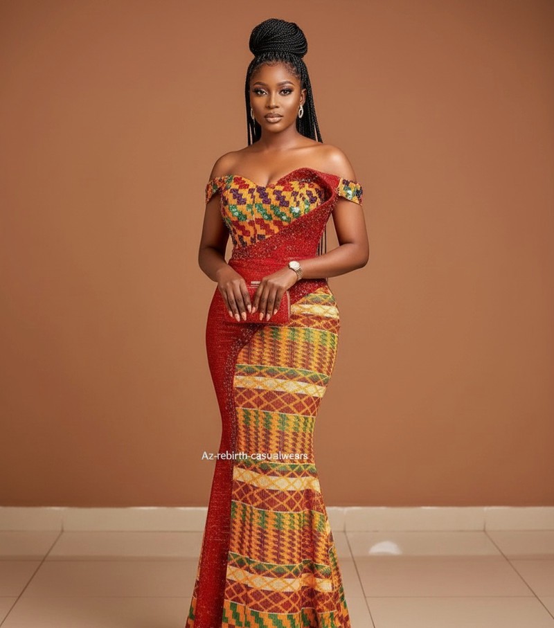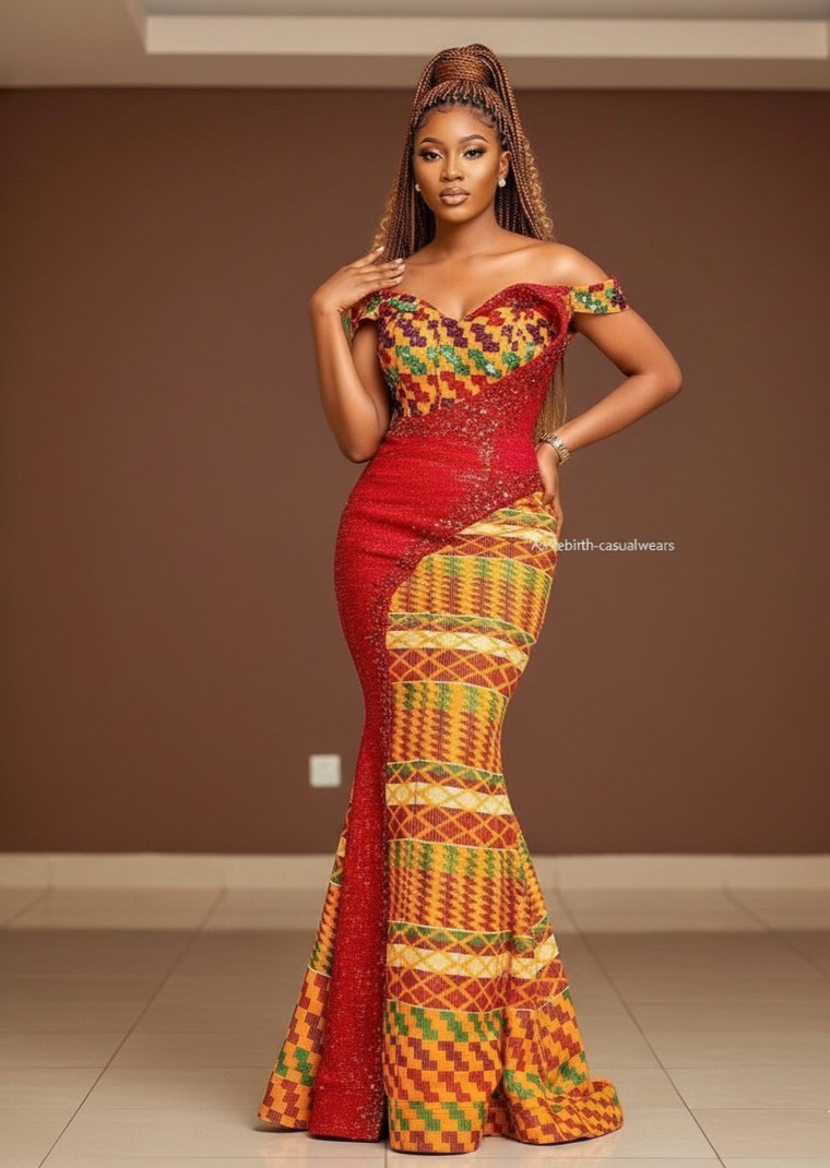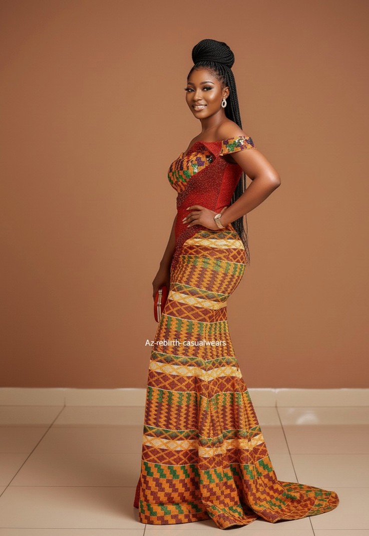 Turn heads in this stunning off-the-shoulder mermaid gown featuring a bold combination of shimmering fabric and vibrant African Kente print.