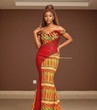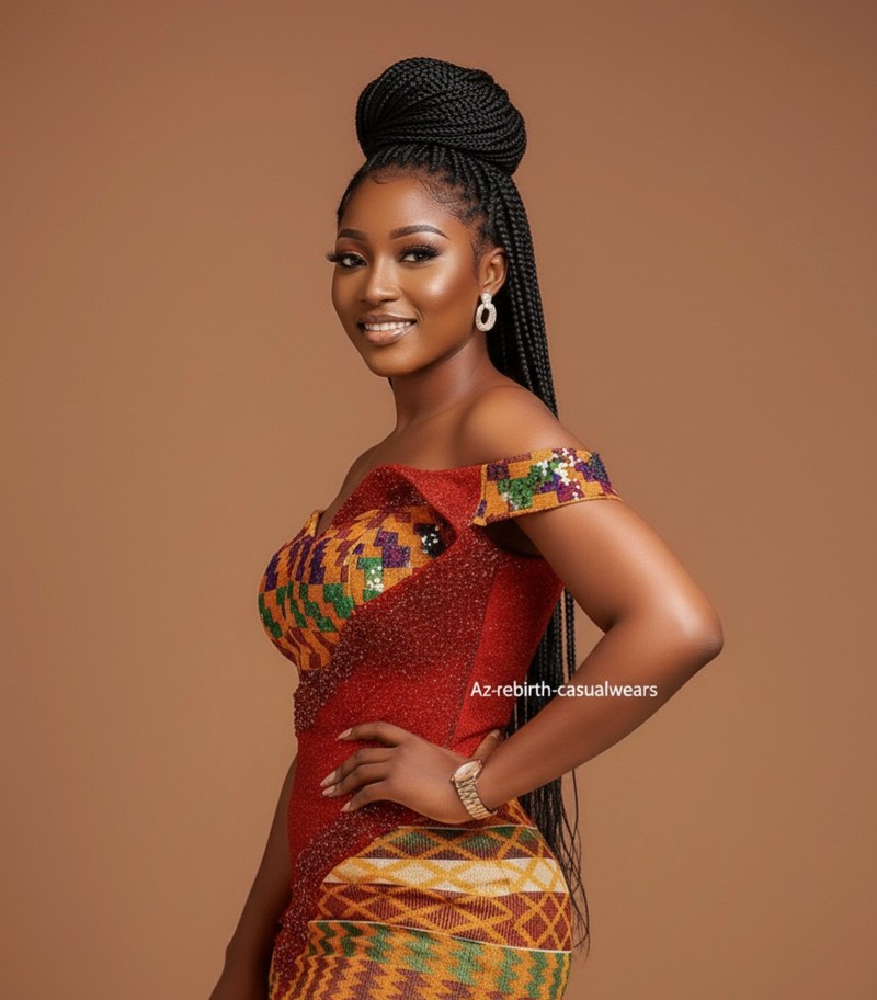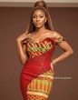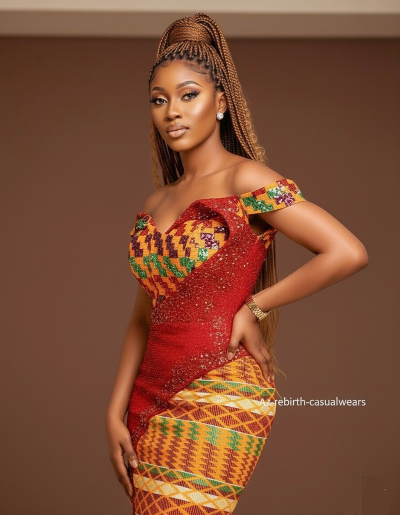The dress boasts a fitted, figure-flattering silhouette with a sweetheart neckline and beautiful off-the-shoulder sleeves. The design is a captivating mix: the top bodice is a dazzling red fabric with intricate sequin detailing, while the lower half showcases the rich, traditional patterns of Kente cloth. This fusion creates a modern yet cultural statement piece, perfect for weddings, traditional ceremonies, or any grand event.