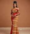 Striking African Print Kente Mermaid Gown Turn heads in this stunning off-the-shoulder mermaid gown featuring a bold combination of shimmering fabric and vibrant African Kente print. The dress boasts a fitted, figure-flattering silhouette with a sweetheart neckline and beautiful off-the-shoulder sleeves. The design is a captivating mix: the top bodice is a dazzling red fabric with intricate sequin detailing, while the lower half showcases the rich, traditional patterns of Kente cloth. This fusion creates a modern yet cultural statement piece, perfect for weddings, traditional ceremonies, or any grand event. Key Features: Fabric: Authentic Kente print and sequin-detailed fabric. Style: Off-the-shoulder, sweetheart neckline, mermaid silhouette. Fit: Fitted bodice and flare bottom for a stunning shape. Available in all sizes! Order now for fast shipping!