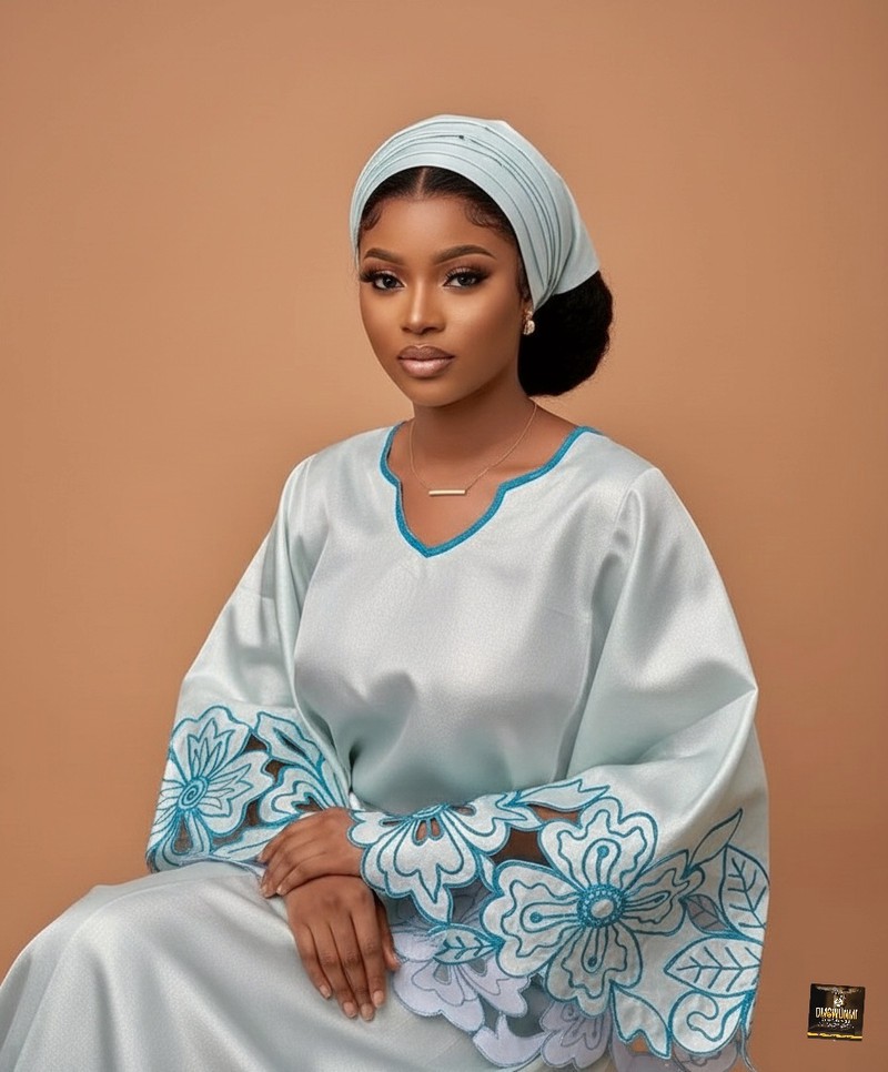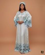This graceful, floor-length gown is fashioned from a smooth, luxurious satin fabric in a soft, ethereal mint green shade, offering a lustrous drape and comfortable kaftan silhouette. The design is subtly elegant, featuring a simple scoop neckline and wide, flowing sleeves. The key decorative element is the intricate embroidery and cutwork applied to the sleeves and the hemline, showcasing large, stylized floral and curvilinear patterns executed in a striking turquoise / teal blue thread. This embroidery is bordered by a delicate scalloped edge, revealing a contrasting subtle layer beneath the cutouts, which adds a sophisticated, textural dimension to the garment. The ensemble is completed with a coordinating fabric headwrap, enhancing its refined appeal. This light and airy kaftan is perfectly suited for special daytime celebrations, elegant resort wear, sophisticated religious holidays, or semi-formal summer events, appealing to customers seeking gentle color and detailed, handcrafted embellishment. Material: Satin Color: Mint green