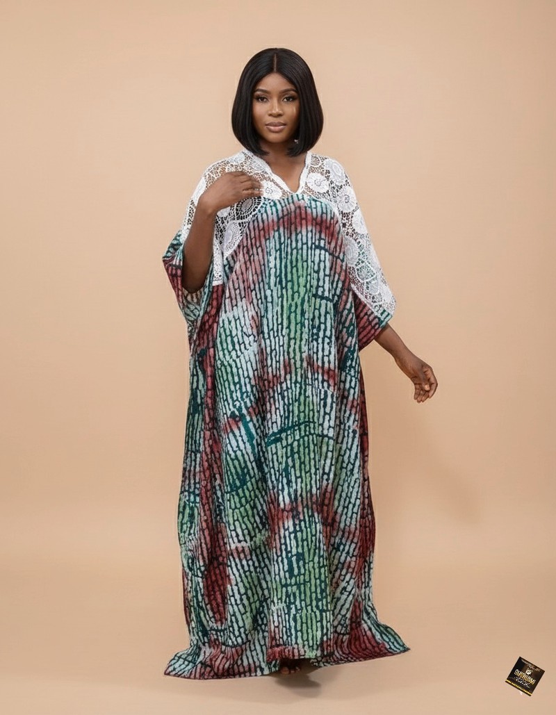 This graceful floor-length boubou dress is expertly fashioned from premium hand-dyed batik cotton, providing a breathable and structured silhouette that ensures comfort while maintaining a grand, regal aesthetic. The garment features a vibrant emerald green and earthy brick-red base with an intricate, vertical hand-stamped pattern, beautifully contrasted by a delicate white floral lace yoke that covers the shoulders and neckline for a touch of feminine luxury. Its voluminous, free-flowing design offers effortless movement and an airy feel, making it an exceptional choice for high-end cultural ceremonies, wedding receptions, or sophisticated evening events where a blend of traditional craftsmanship and modern elegance is desired.