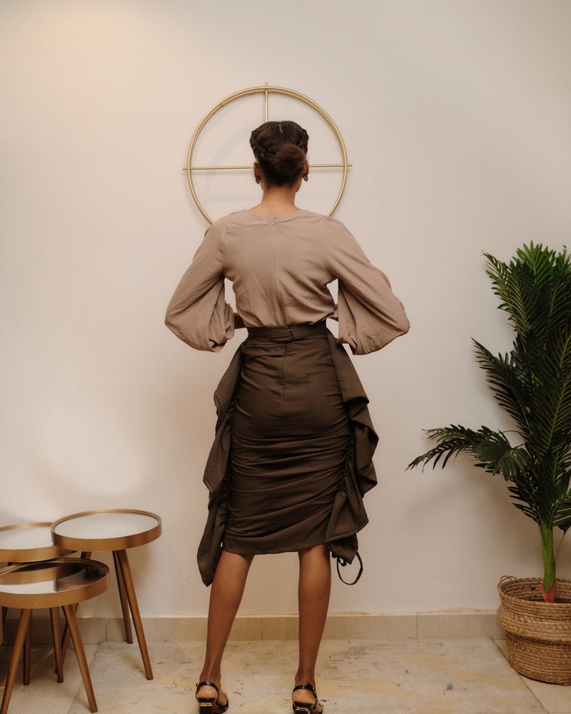 Step into your power with Adamma, a stunning two-piece set made for the modern working woman who moves with grace and intention. Effortlessly elegant and unapologetically bold, this ensemble blends structure with softness, ambition with allure. The ruched skirt, crafted from premium Lycra crepe, features adjustable side strings that allow you to play with length, from a chic midi to a dramatic ankle-grazing finish. Paired with a breezy, bell-sleeved top in a rich nude-toned crepe, this look strikes a harmonious balance between comfort and style. Whether you're commanding the boardroom or catching up with friends over lunch, Adamma moves with you, hugs in all the right places, and lets you decide how the day flows. And because beauty knows no bounds, Adamma is available in all sizes at no extra charge. Wear it to work. Wear it to wine down. Just make sure you wear it like the queen you are. Care Instruction: To preserve the beauty and longevity of your Adamma set, we recommend hand washing each piece separately using a gentle, mild detergent. Avoid machine washing or bleach, as these can affect the integrity of the fabric and its rich hues. For a polished finish, press on the reverse side with a cool iron. With just a little love, your Adamma will continue to serve timeless elegance, wear after wear.