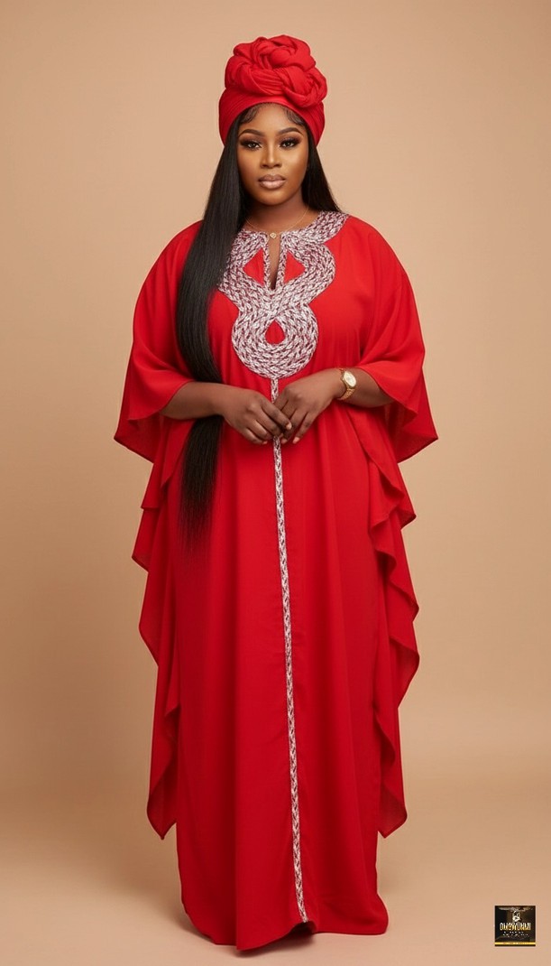 This breathtaking, floor-length kaftan is rendered in a vivid, high-impact red, utilizing a smooth, flowing crepe fabric that drapes beautifully over the body, creating an opulent and comfortable silhouette. The dress features dramatic, voluminous sleeves that cascade in ruffled layers down the side seams, adding significant movement and flair to the garment. The central focus is the intricate, ornate silver or white embroidery that frames the modest V-neckline and extends downward in a symmetrical, knot-like or curvilinear design, continuing as a detailed vertical stripe along the center front of the kaftan, emphasizing the length and adding a touch of metallic contrast. The ensemble is impeccably styled with a matching red fabric turban that crowns the look. This striking red kaftan is ideally suited for major cultural celebrations, high-end festive holiday parties, formal family gatherings, or significant ceremonies, appealing to customers who want to make a bold, elegant statement while maintaining modesty and comfort.