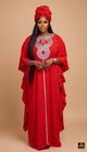 This breathtaking, floor-length kaftan is rendered in a vivid, high-impact red, utilizing a smooth, flowing crepe fabric that drapes beautifully over the body, creating an opulent and comfortable silhouette. The dress features dramatic, voluminous sleeves that cascade in ruffled layers down the side seams, adding significant movement and flair to the garment. The central focus is the intricate, ornate silver or white embroidery that frames the modest V-neckline and extends downward in a symmetrical, knot-like or curvilinear design, continuing as a detailed vertical stripe along the center front of the kaftan, emphasizing the length and adding a touch of metallic contrast. The ensemble is impeccably styled with a matching red fabric turban that crowns the look. This striking red kaftan is ideally suited for major cultural celebrations, high-end festive holiday parties, formal family gatherings, or significant ceremonies, appealing to customers who want to make a bold, elegant statement while maintaining modesty and comfort. Material: crepe Color: red