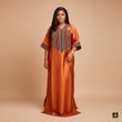 This elegant floor-length kaftan, designed for comfort and sophistication, is crafted in a luxurious, deep burnt orange satin fabric that flows gracefully to the floor. The garment features a traditional, relaxed silhouette with wide, elbow-length sleeves, accented by a striking V-neck yoke panel over the chest. This central panel showcases rich, horizontal stripe detailing in shades of earthy brown, metallic gold, and muted red, bordered by thin metallic piping, which adds a touch of traditional, high-end design. The contrasting colors and textures on the yoke create a majestic and distinguished focal point, while subtle side slits ensure ease of movement, making this kaftan a luxurious and comfortable statement piece.