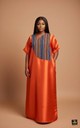 This elegant, floor-length kaftan, designed for sophisticated comfort, is crafted from a luxurious, smooth, satin fabric in a rich, vibrant orange hue. The garment is cut in a relaxed, flowing silhouette with wide, short kimono sleeves that feature a folded cuff detail. A striking asymmetrical yoke adds unique visual interest, covering the right shoulder and chest in a wide swath of colorful, textured fabric featuring vertical stripes in shades of navy, gold, red, and blue, contrasting beautifully with the solid orange base. This unique design element, coupled with the functional side pocket, elevates the simple kaftan into a modern and eye-catching statement piece perfect for special occasions.