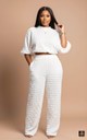 Elevate your casual wardrobe with this ultra-stylish and comfortable two-piece textured lounge set in a rich, earthy white color. The fabric features a distinctive puckered, quilted, or textured finish that adds depth and unique visual interest to the ensemble. The top is a relaxed cropped style with a classic mock neckline and features voluminous, puffed short sleeves that gather slightly at the cuff, offering a fashionable yet relaxed silhouette. The matching high-waisted pants have a comfortable elasticated waistband and fall into a chic wide-leg cut, ensuring unrestricted movement. Practicality is included with side seam pockets on the trousers. This monochromatic set is the definition of elevated comfort, perfect for effortless daytime wear, traveling, or cozy yet stylish weekends.