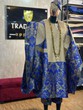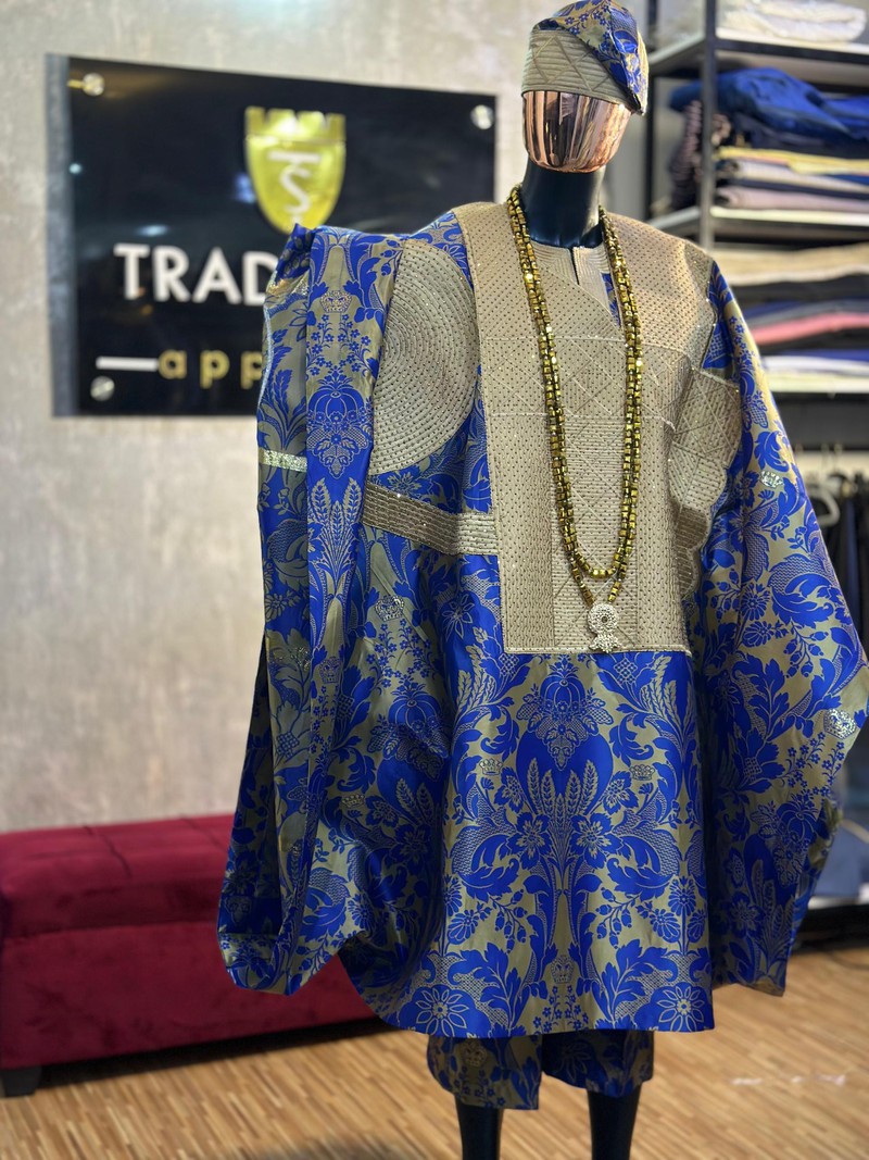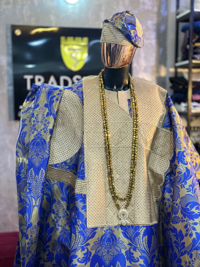 Blue Damask, gold-embroidered agbada with danshiki and matching pants