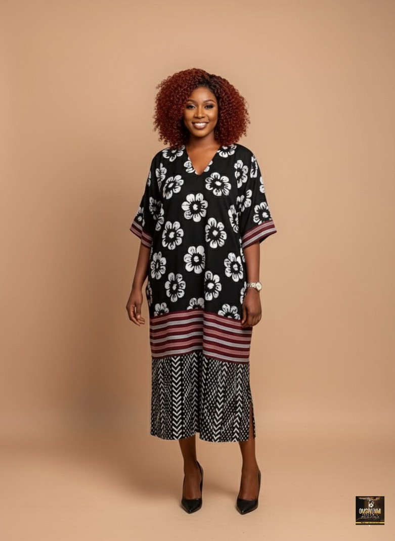 Stay effortlessly stylish with this black floral and striped dress. The V-neck and loose gown bring a balance of comfort and elegance. The monochrome floral design with maroon borders gives it a rich, traditional touch with a modern flair. Perfect for casual outings, office days, or evening events. Style Tip: Complete the look with statement earrings and classic pumps. Material: Ankara and handwoven aso-oke Color: Multicolor