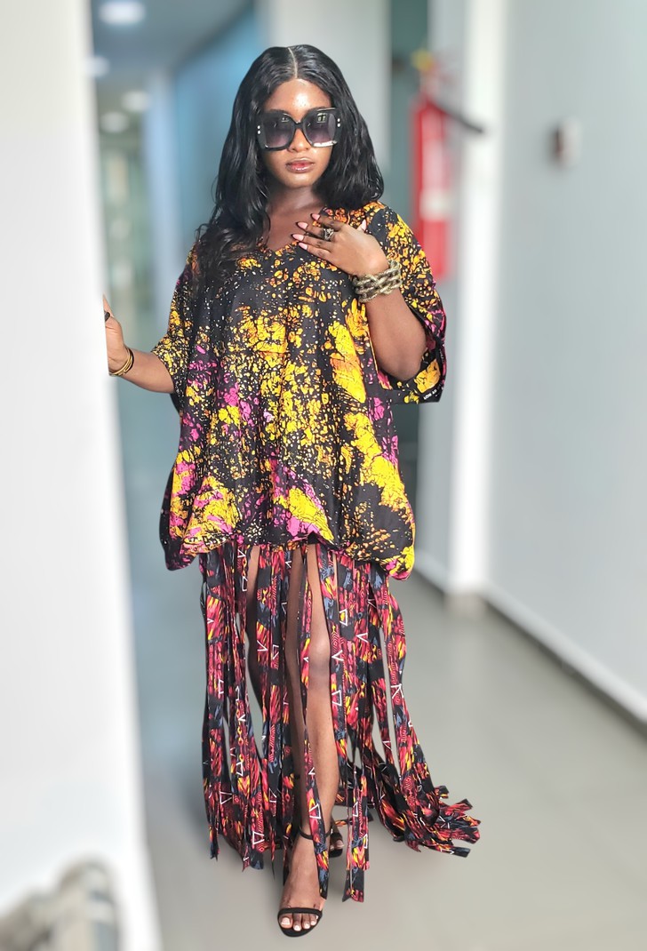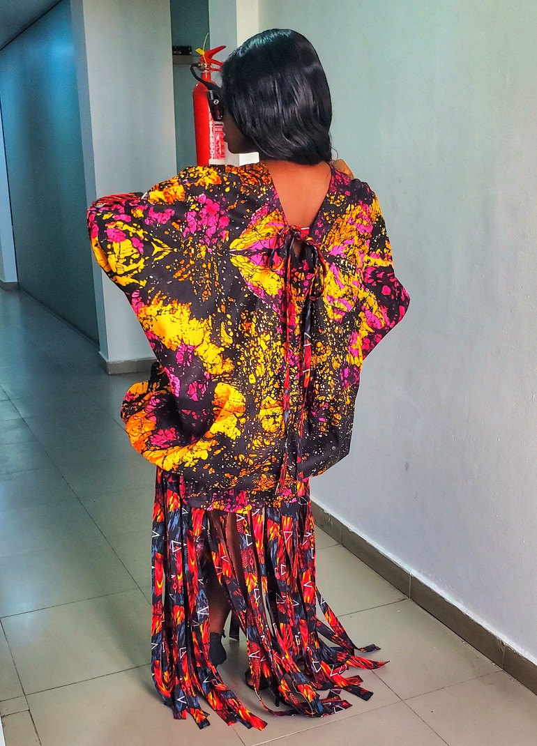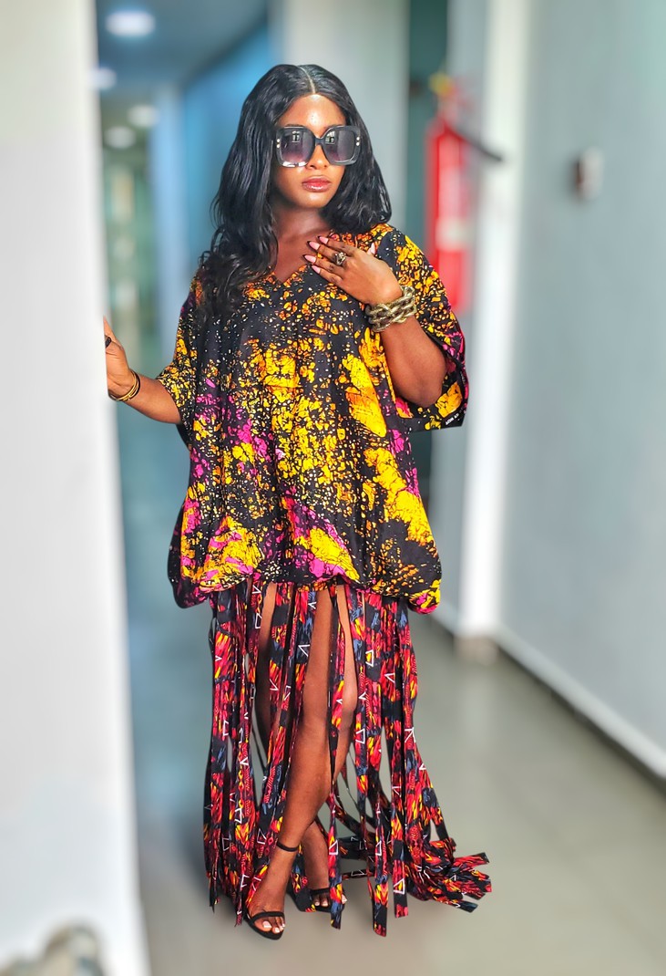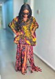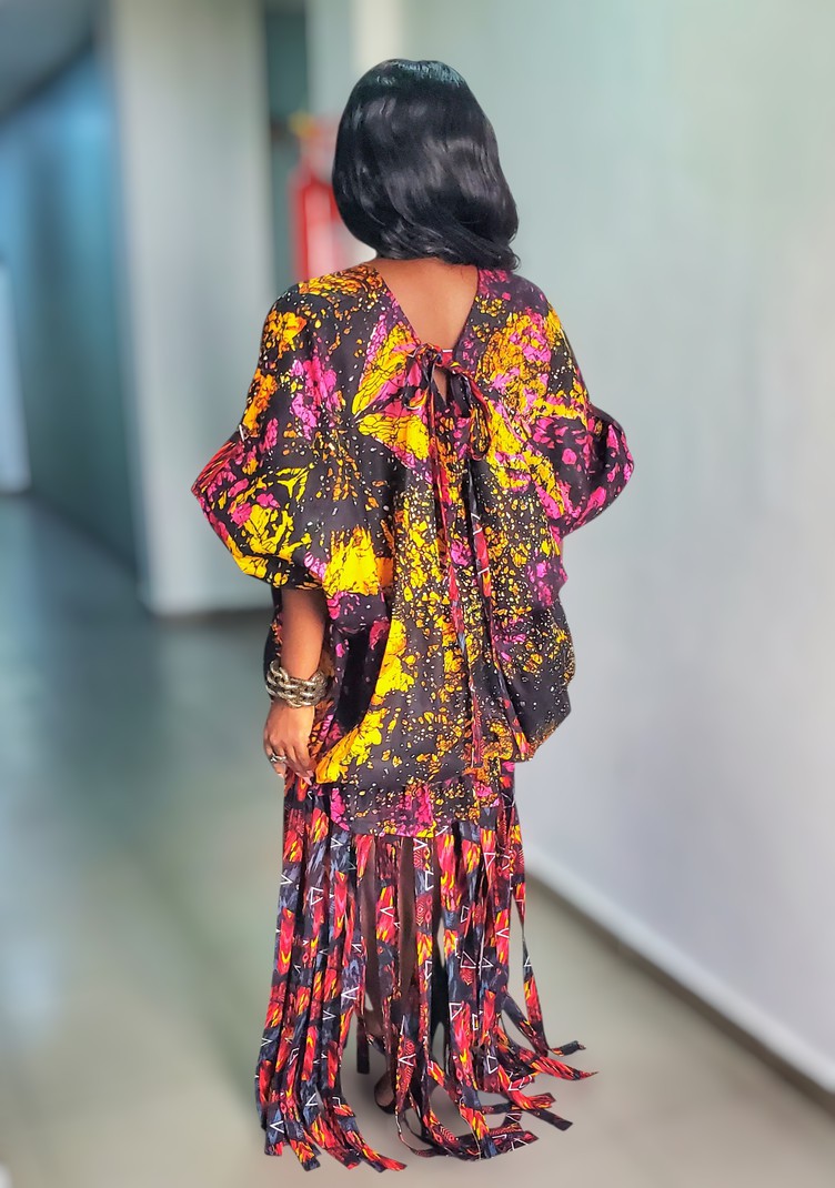 This piece is delicately handmade from batik fabric combined with ankara/wax fabric. It is designed as a long dress; the top part of the dress features a tie-back design and statement sleeves. The top part of the dress has a stretchy band that makes it adjustable.