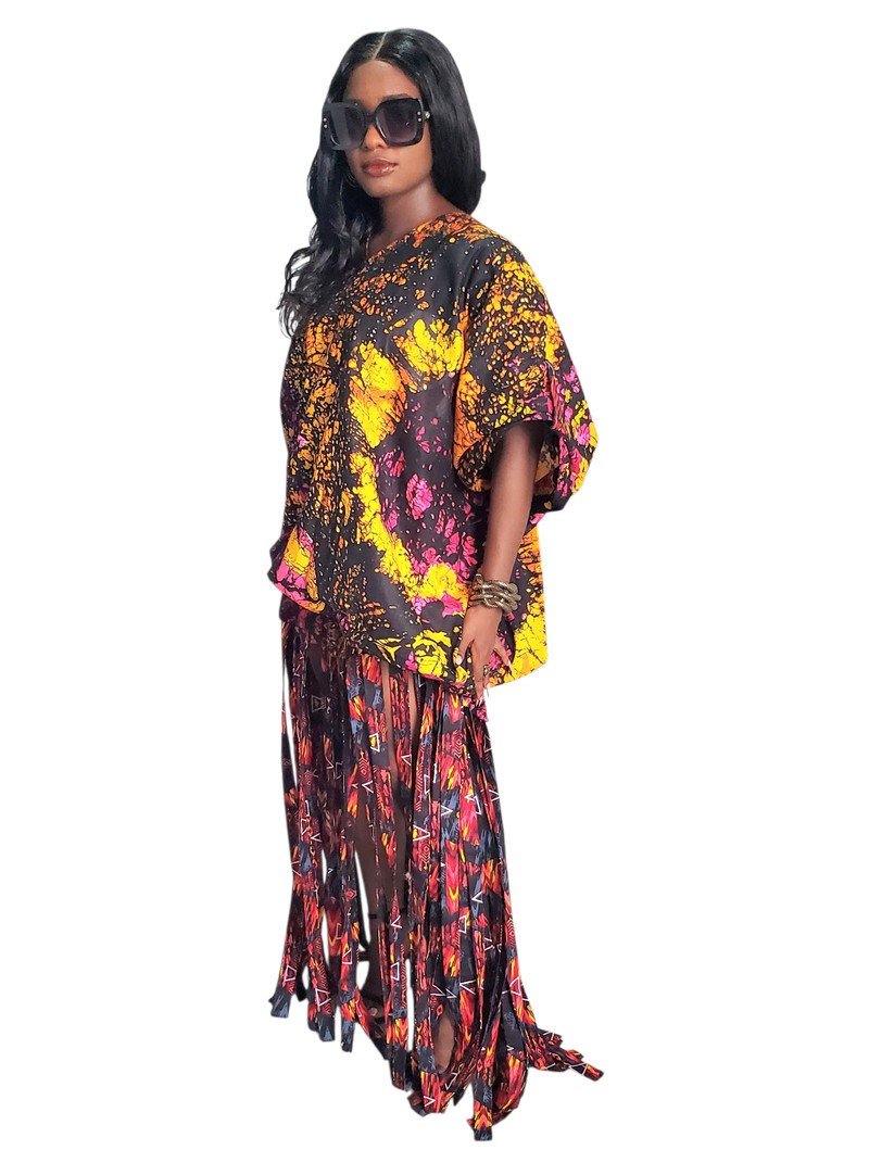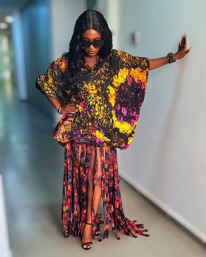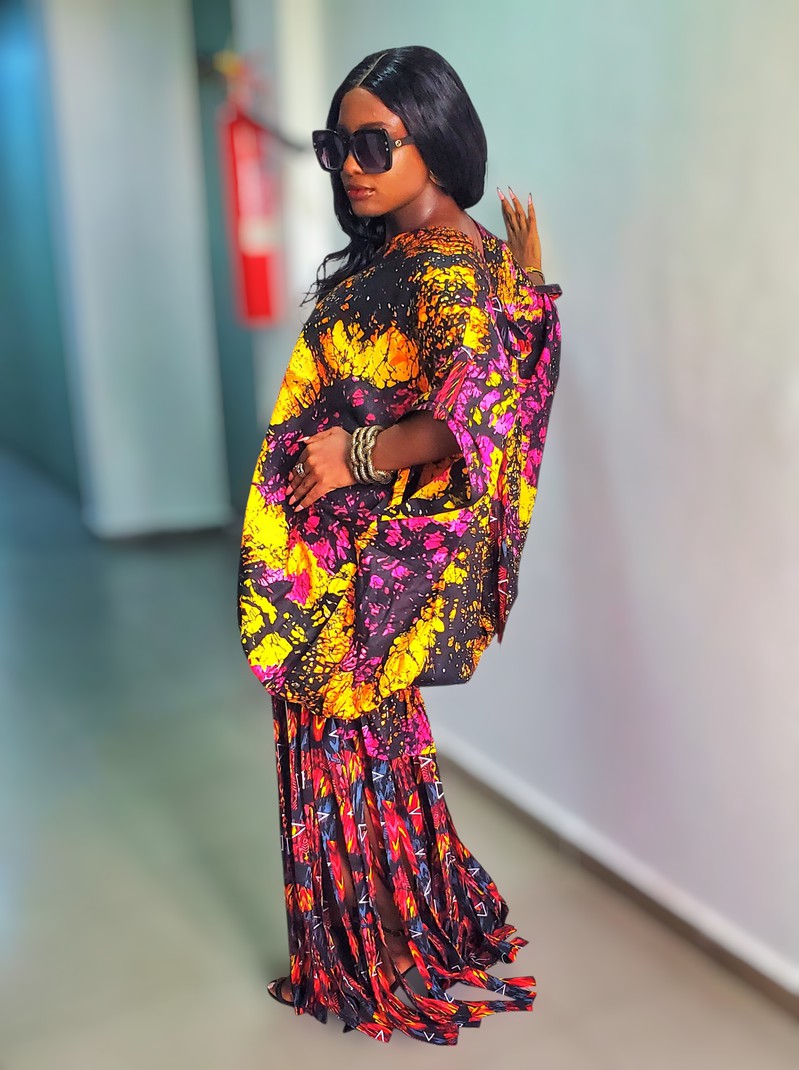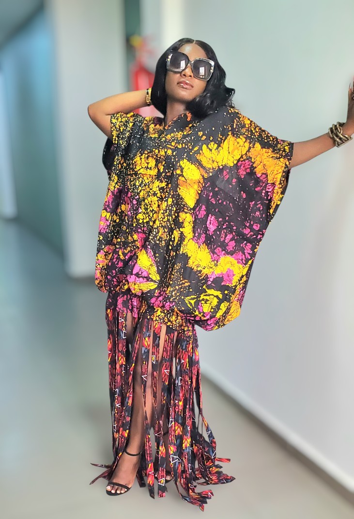 This piece is delicately handmade from batik fabric combined with ankara/wax fabric. It is designed as a long dress; the top part of the dress features a tie-back design and statement sleeves. The top part of the dress has a stretchy band that makes it adjustable.