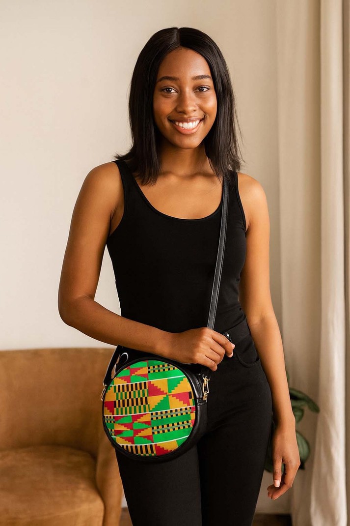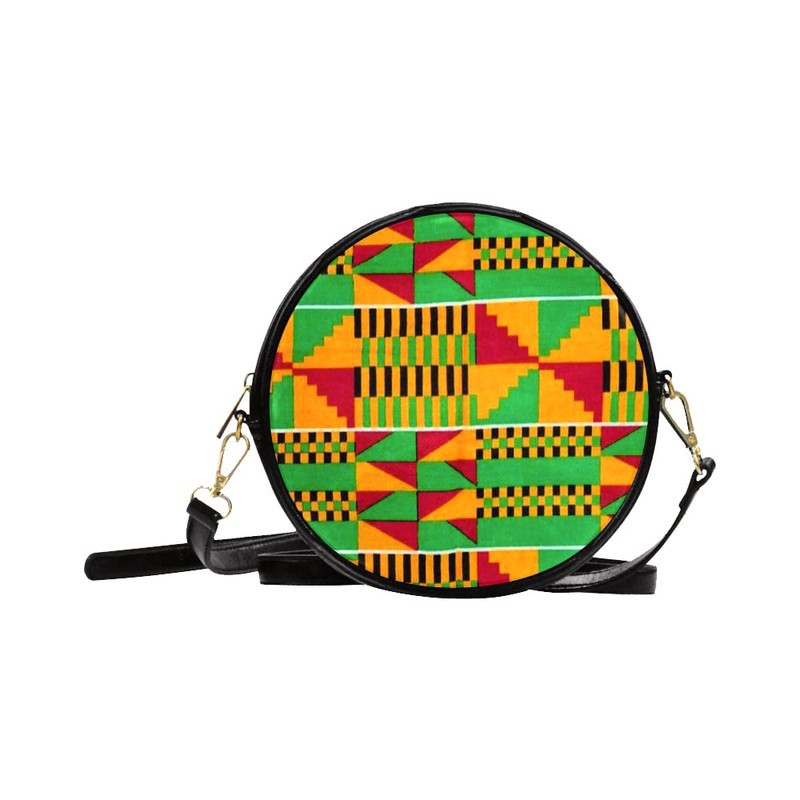 Embrace your adventurous side with our African Bag Sling! Crafted with a vibrant and bold Kente pattern, this bag adds a touch of culture and style to any outfit. With its round design, it's perfect for carrying all your essentials while on the go. Don't be afraid to stand out and make a statement with this unique and eye-catching bag! Product Description * 8.22 Oz. Made from high-grade PU leather. * Single zippered round closure. * One main compartment, big enough to pack cosmetic, sunglasses, Phone and etc. *Adjustable PU leather shoulder strap for easy and comfortable carrying. * Dimensions: 8.07"(L) x 2.07"(W) x 8.07"(H). Delivery Time This item will be processed within 3-7 business days (Excluding Weekends and Holidays). Once products ships it can take up to 15 Business days depending on your location. Out of Stock items can be requested by emailing us at [email protected] Care Instructions Machine wash cold inside out. Gentle cycle with mild detergent and like colors. Do not use bleach or fabric softener. Do not tumble dry to ensure maximum shelf life.