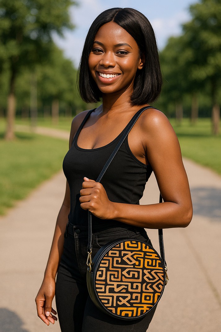 Experience the vibrant culture of Africa with our African Bag Sling! This beautiful round bag features a traditional Kuba print, adding a unique and eye-catching touch to any outfit. Compact and convenient, it's perfect for carrying your essentials while showcasing your love for African heritage.